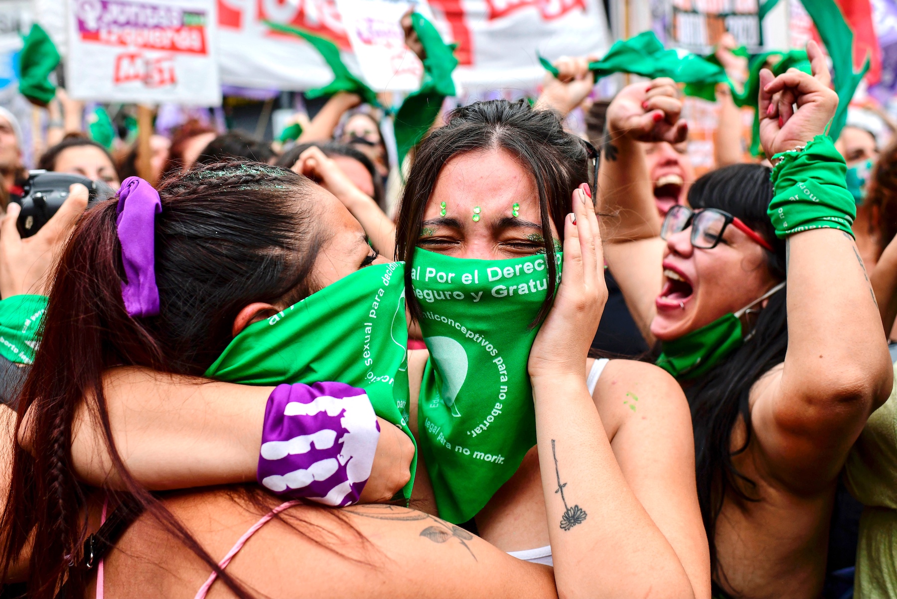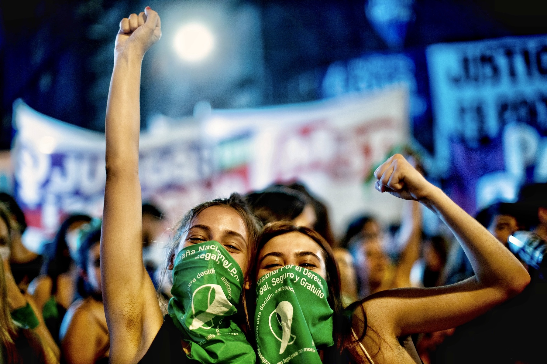 Pro-choice activist pose for a photo while raising their fists outside the National Congress as Deputies vote on a bill to legalize abortion on December 10, 2020 in Buenos Aires, Argentina. (Photo by Tomas Cuesta/Getty Images)