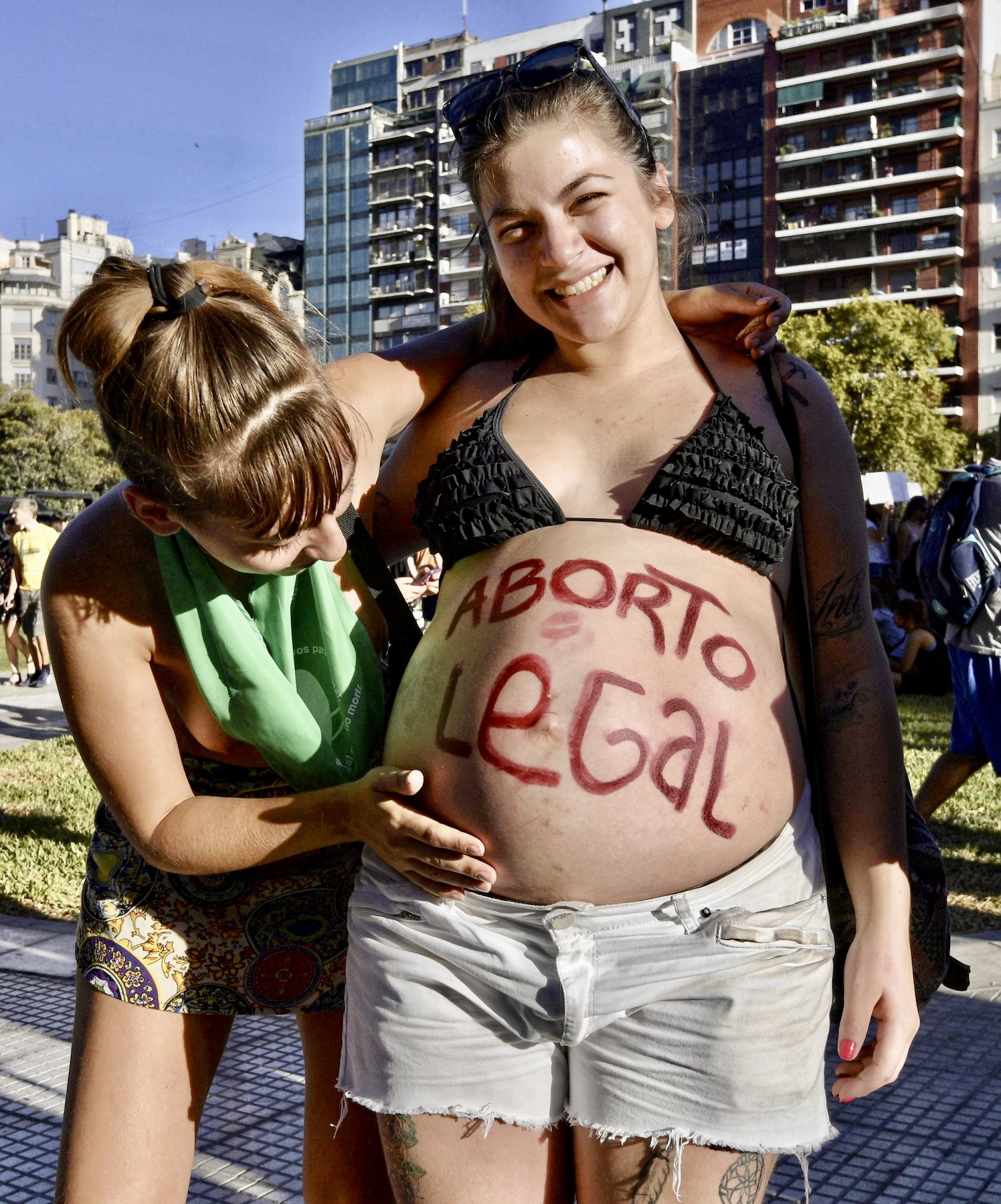 A pregnant young woman with the legend “Legal abortion” written on her belly, takes part in a demonstration marking the International Women’s Day in Buenos Aires on March 8, 2018. (Photo by JUAN MABROMATA/AFP via Getty Images)