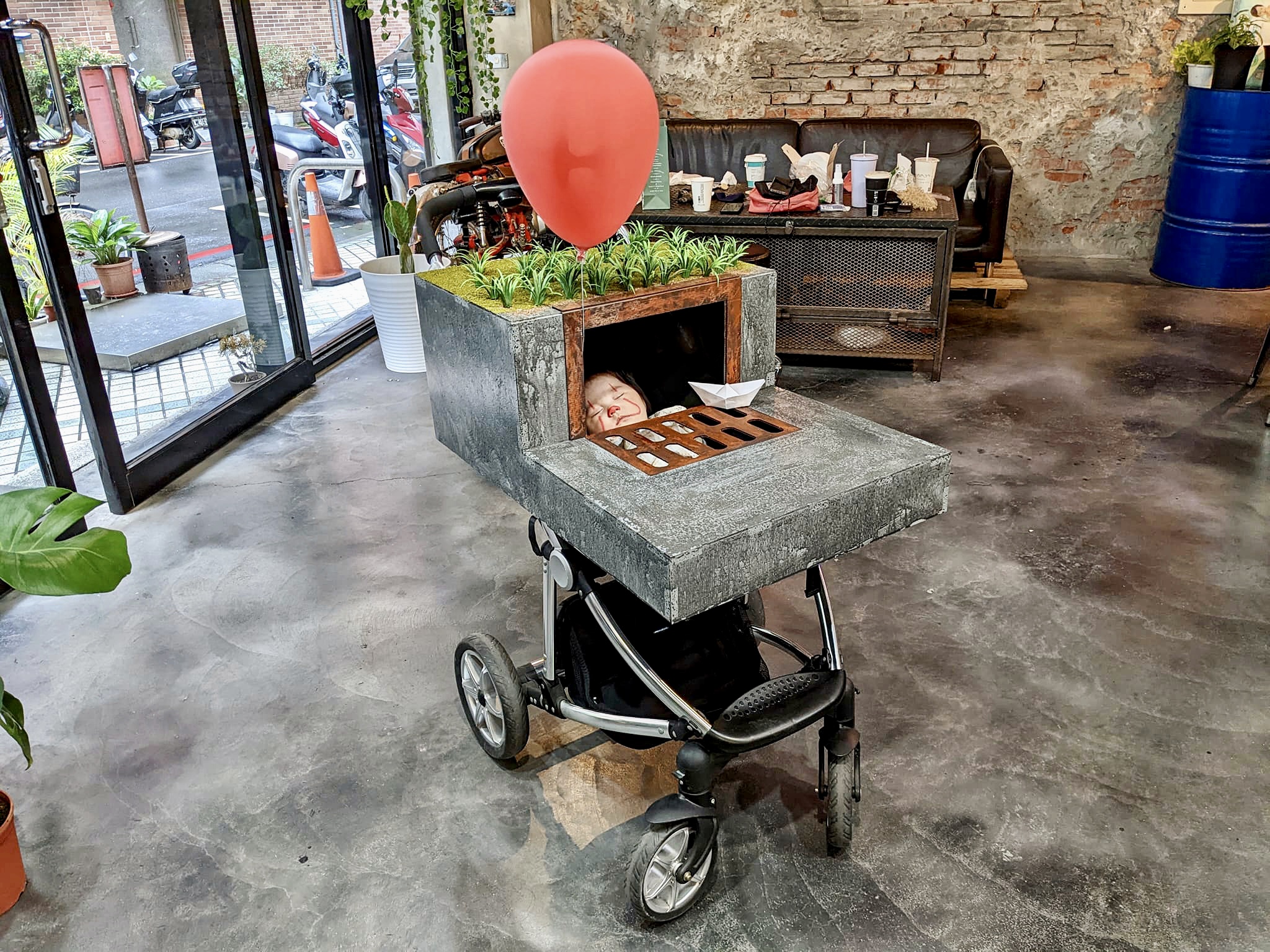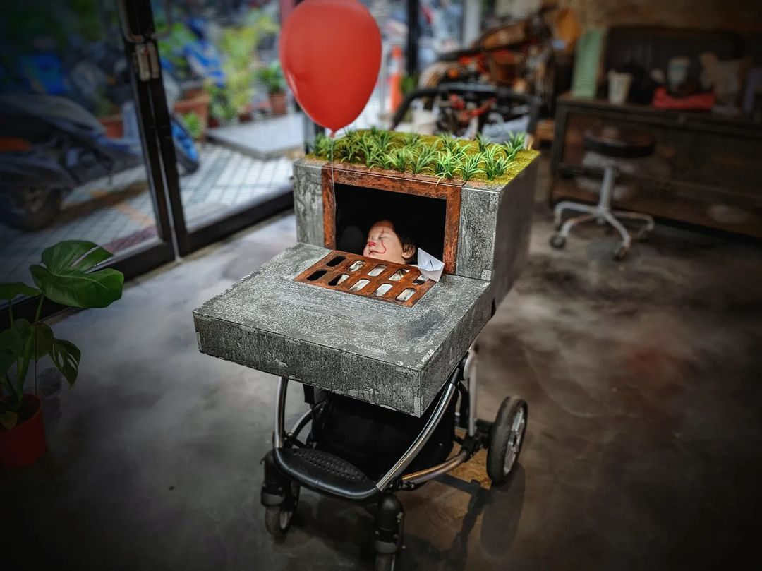 To make the costume even more complete and realistic, her dad also recreated the whole sewer scene by making good use of the baby stroller.