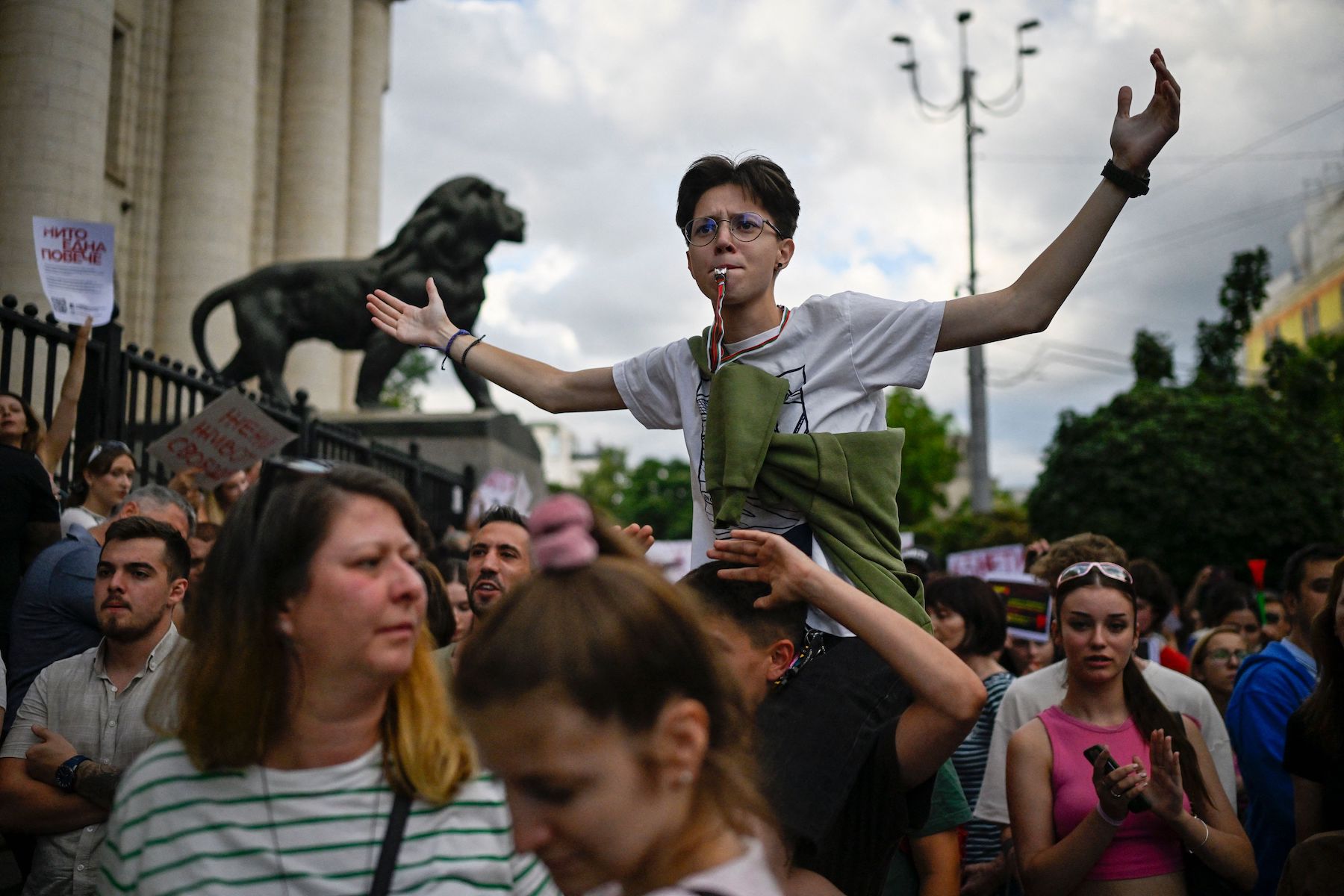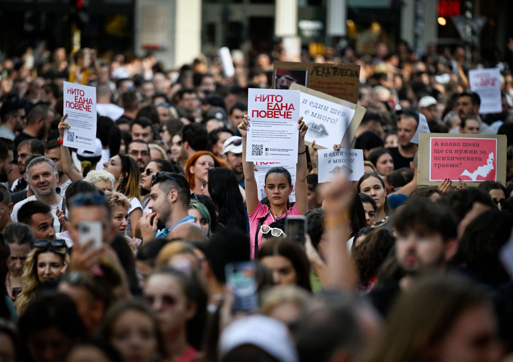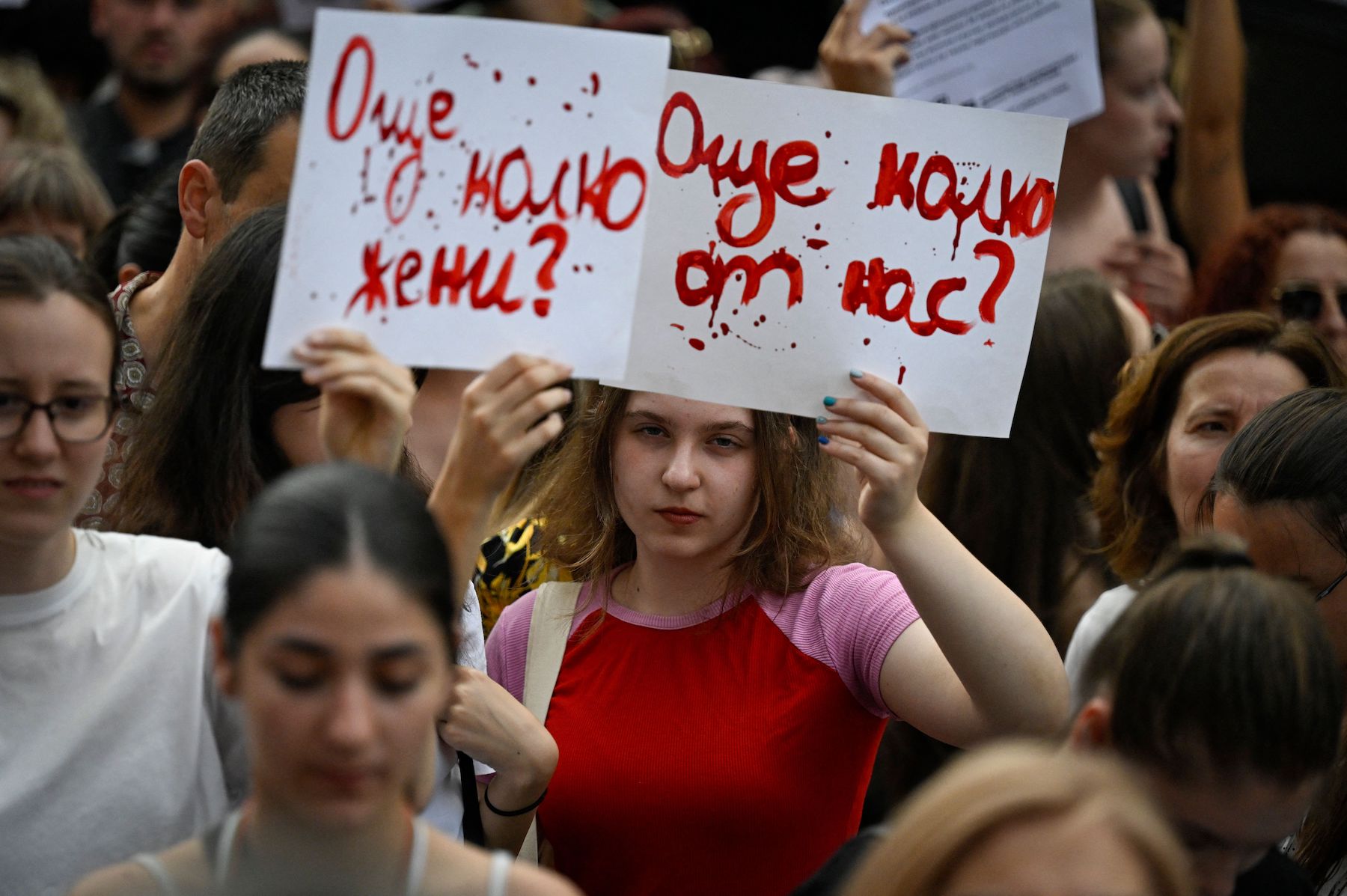 A woman holds a placard reading “Not a single one more!!! Stop” as protesters shout slogans during a demonstration against domestic violence in Sofia, on July 31, 2023. (Photo by NIKOLAY DOYCHINOV/AFP via Getty Images)
