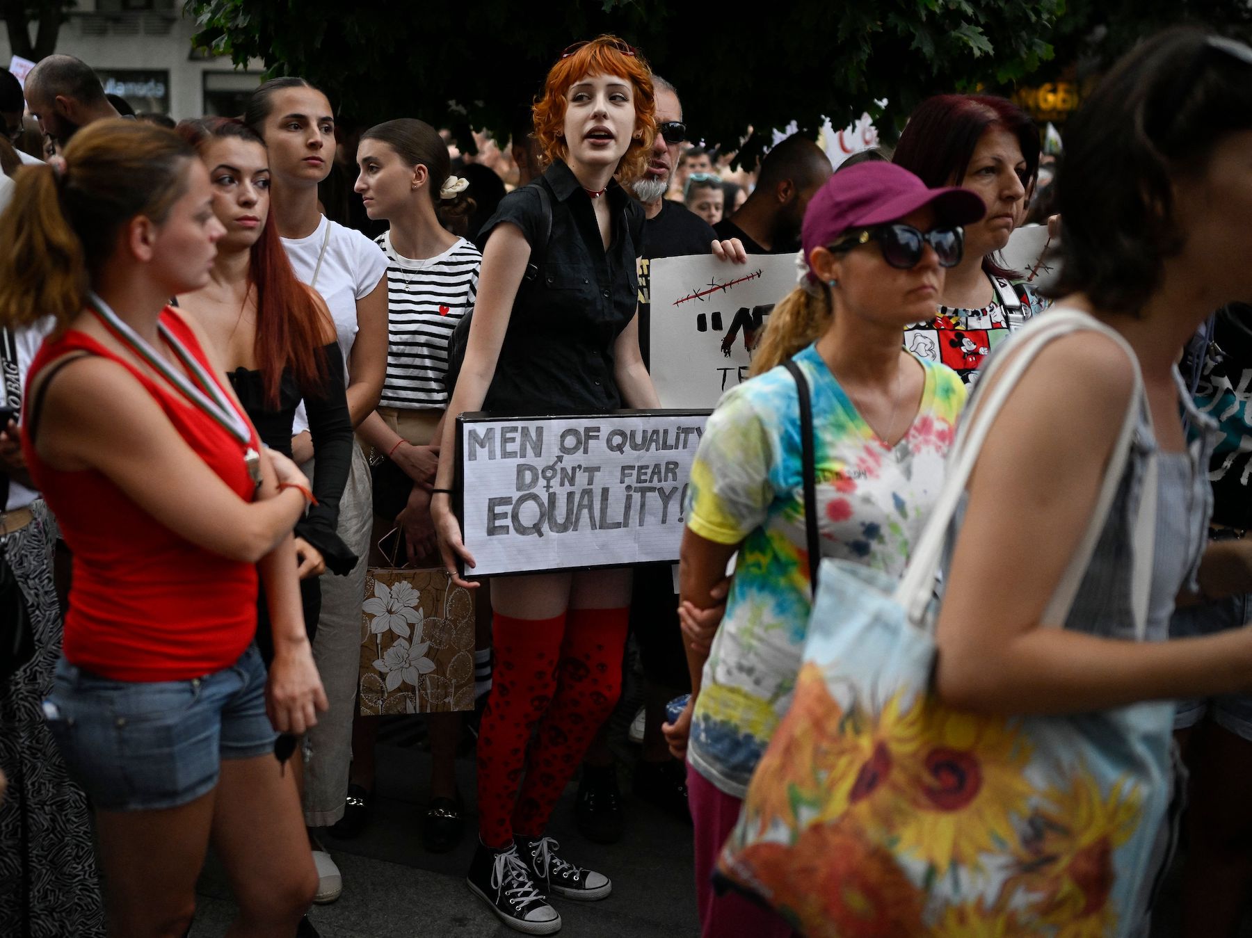 A protester holds a placard reading “Men of quality don’t fear equality” during a demonstration against domestic violence in Sofia, on July 31, 2023. (Photo by NIKOLAY DOYCHINOV/AFP via Getty Images)
