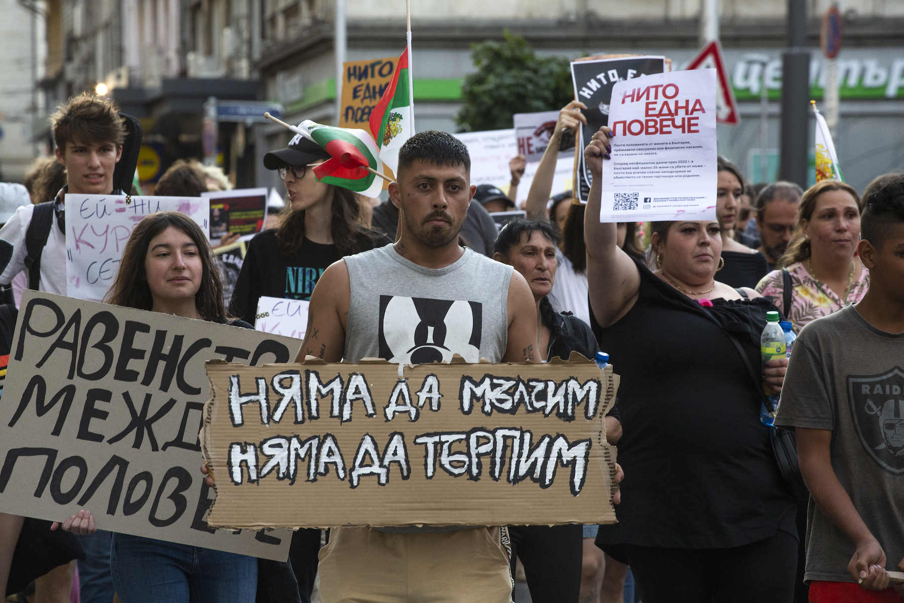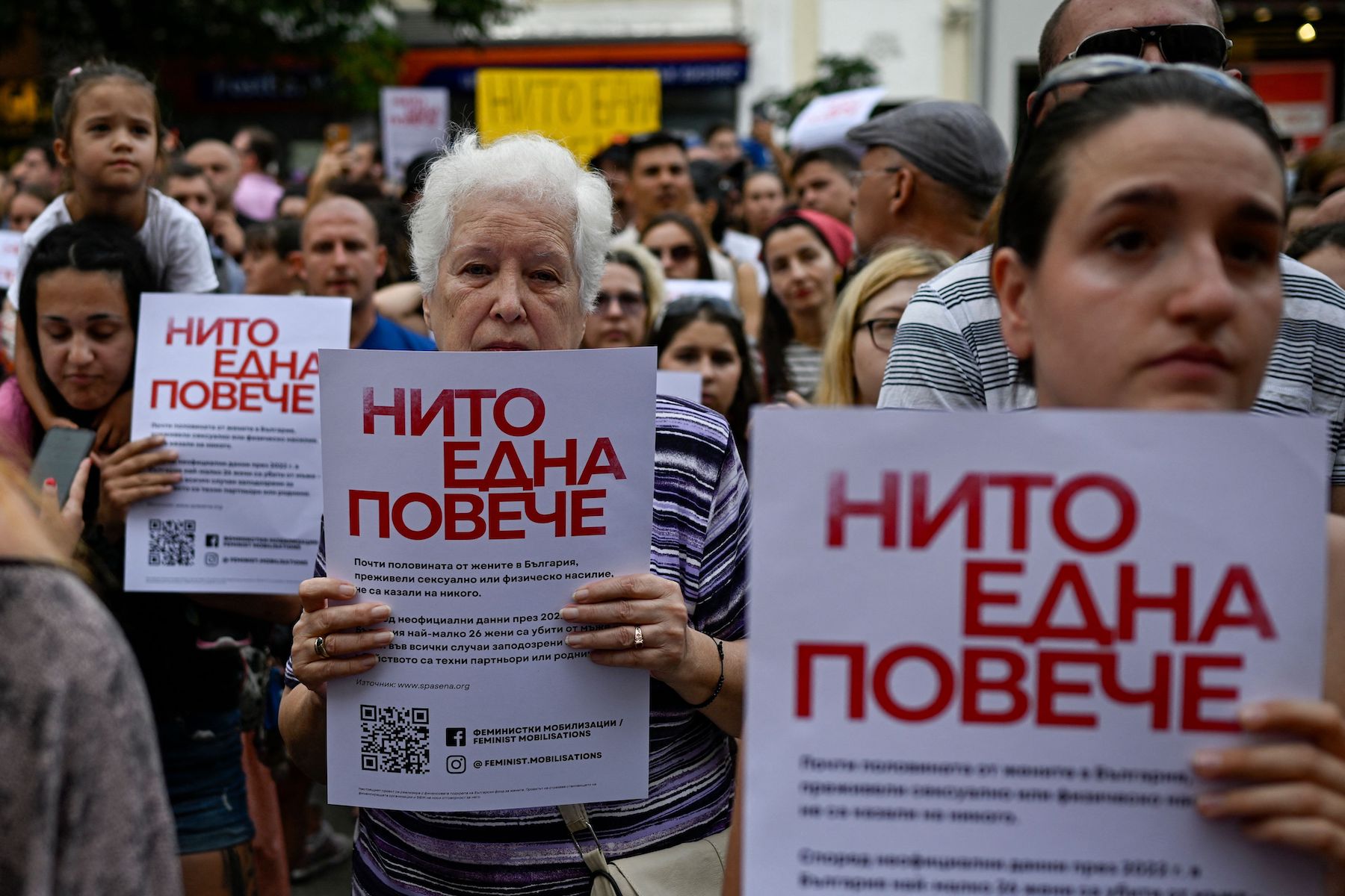 Women hold placards reading “Not a single one more” during a demonstration against domestic violence in Sofia, on July 31, 2023. (Photo by NIKOLAY DOYCHINOV/AFP via Getty Images)