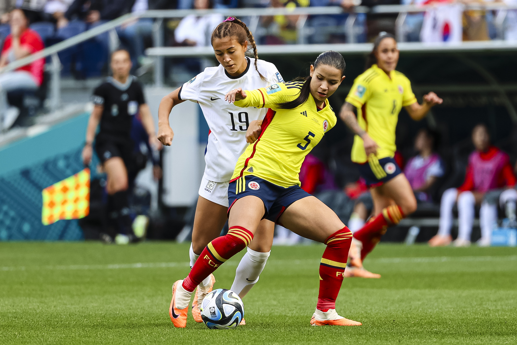 Casey Phair of Korea Republic (L) fights for the ball with Lorena Durango of Colombia (R) during the FIFA Women’s World Cup Australia & New Zealand 2023 Group H match between Colombia and Korea Republic at Sydney Football Stadium on July 25, 2023 in Sydney, Australia. (Photo by Patricia Pérez Ferraro/Eurasia Sport Images/Getty Images)