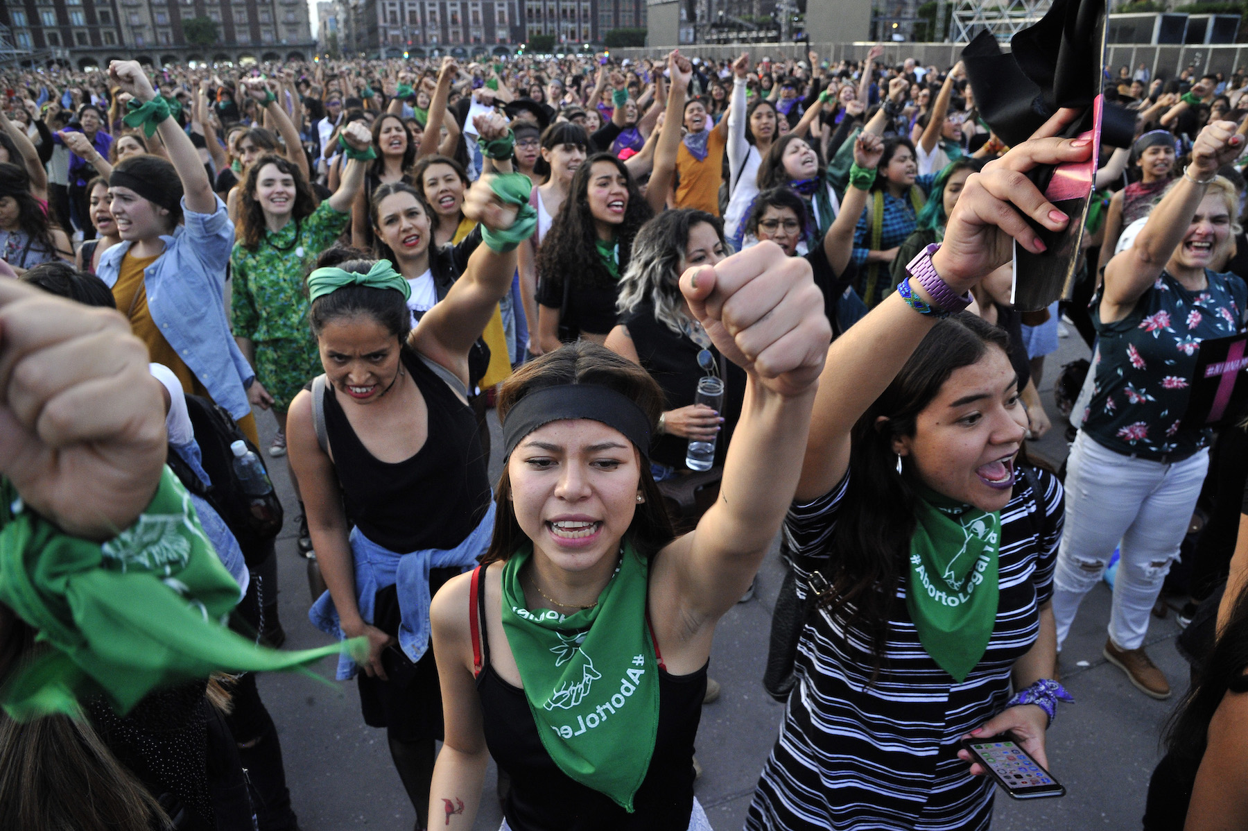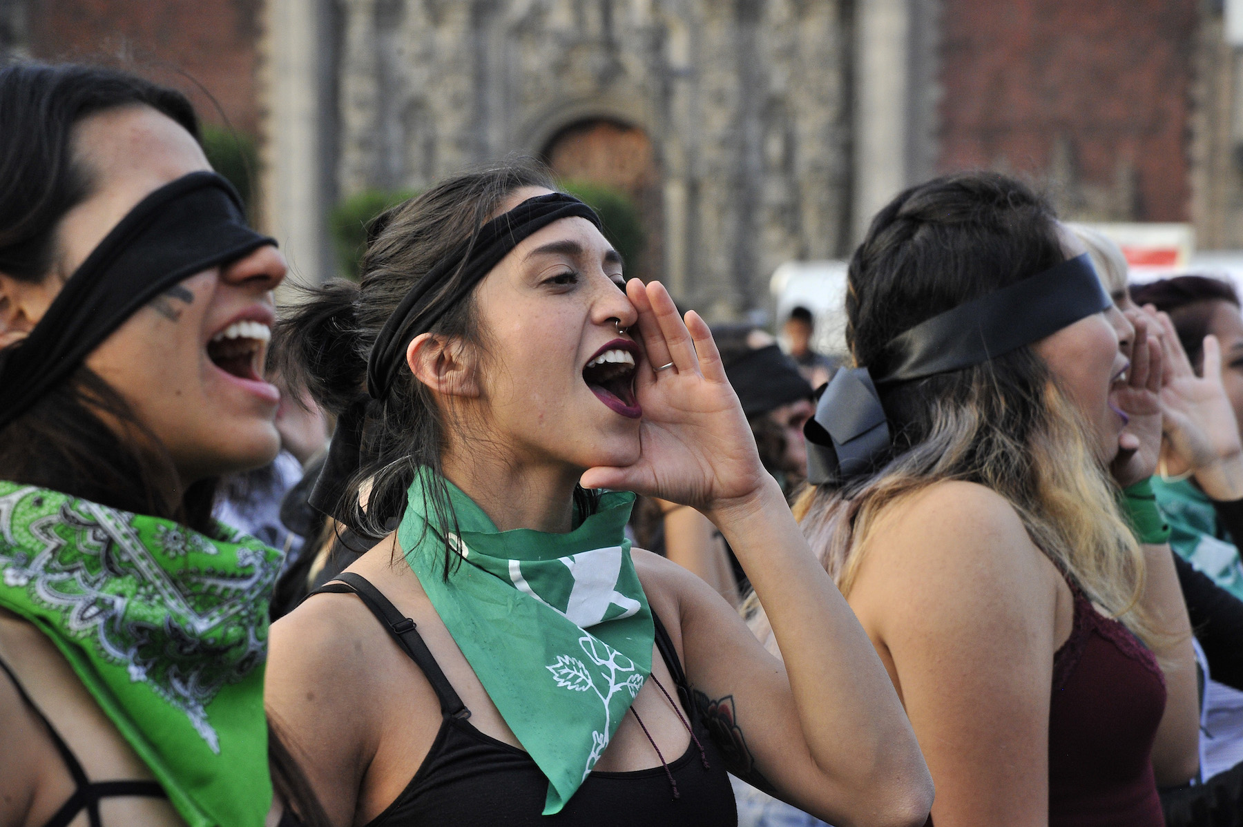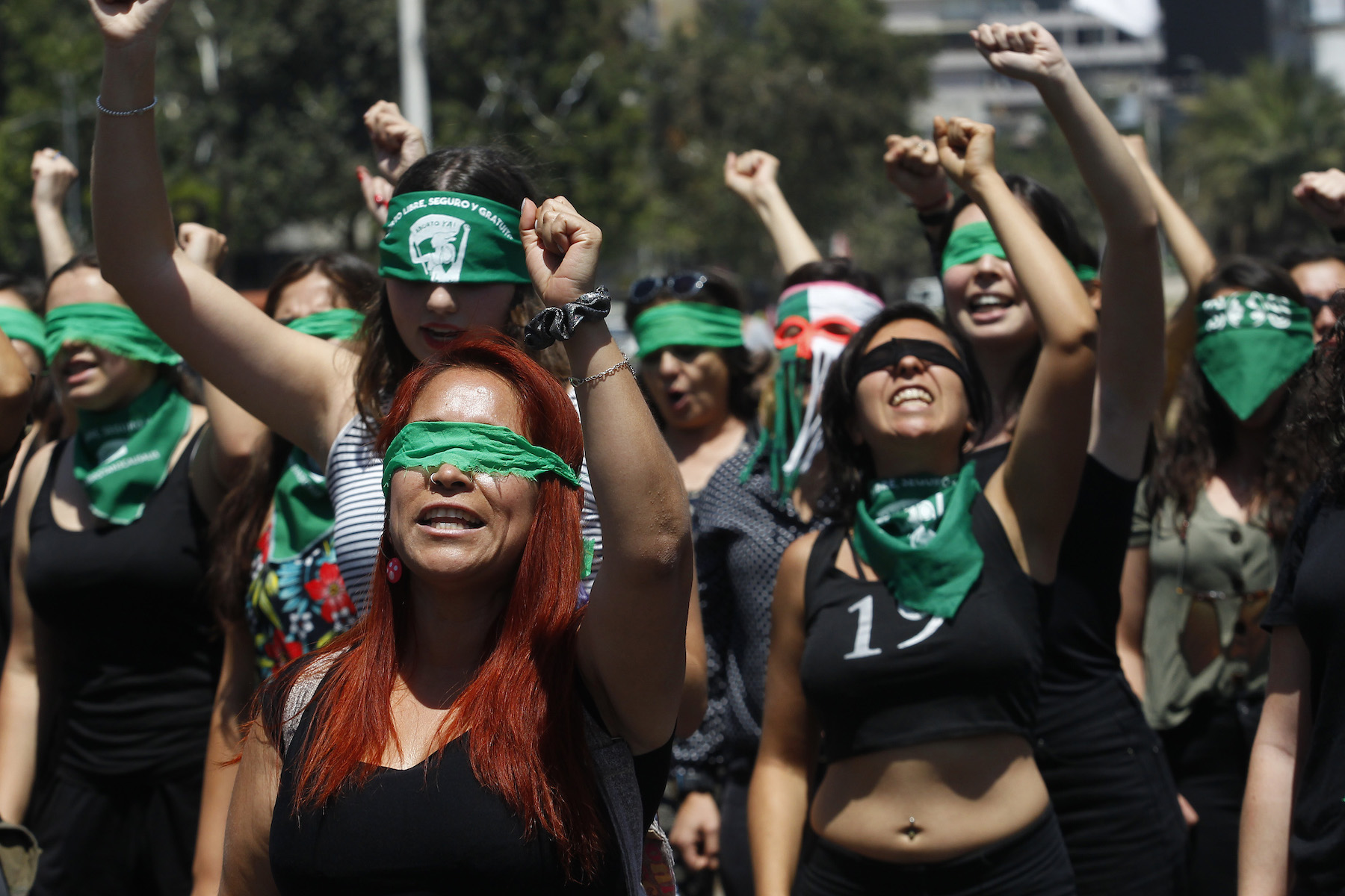 Demonstrators wearing green handkerchiefs covering their eyes sing and dance to protest violence against women on December 6, 2019 in Santiago, Chile. (Photo by Marcelo Hernandez/Getty Images)