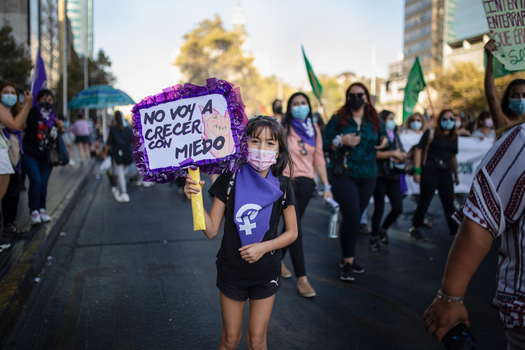 A girl holds a protest sign in Santiago, Chile, during a demonstration on International Women’s Day on March 8. (Photo by Vanessa Rubilar/SOPA Images/LightRocket via Getty Images)