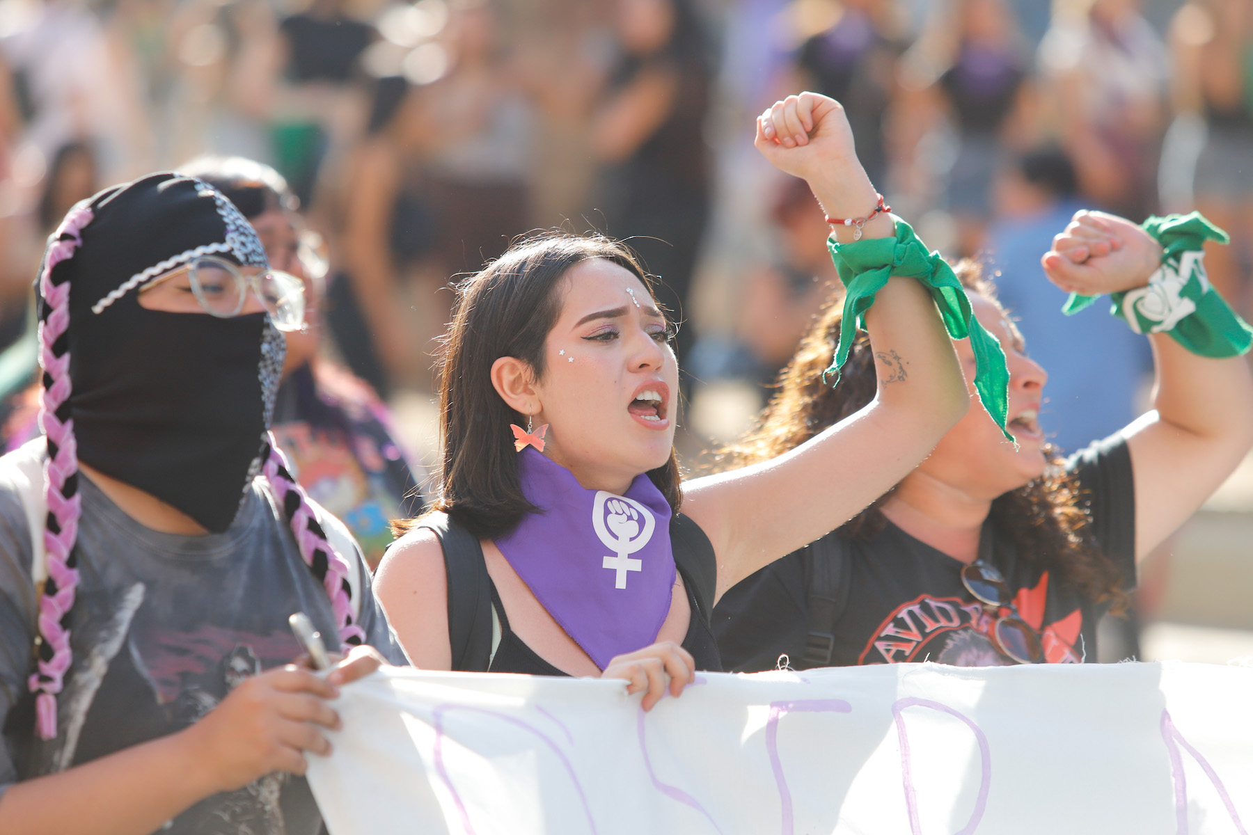 Women take part in a demonstration for the International Women’s Day, in Santiago, Chile, on March 8, 2023 (Photo by Francisco Paredes/NurPhoto via Getty Images)