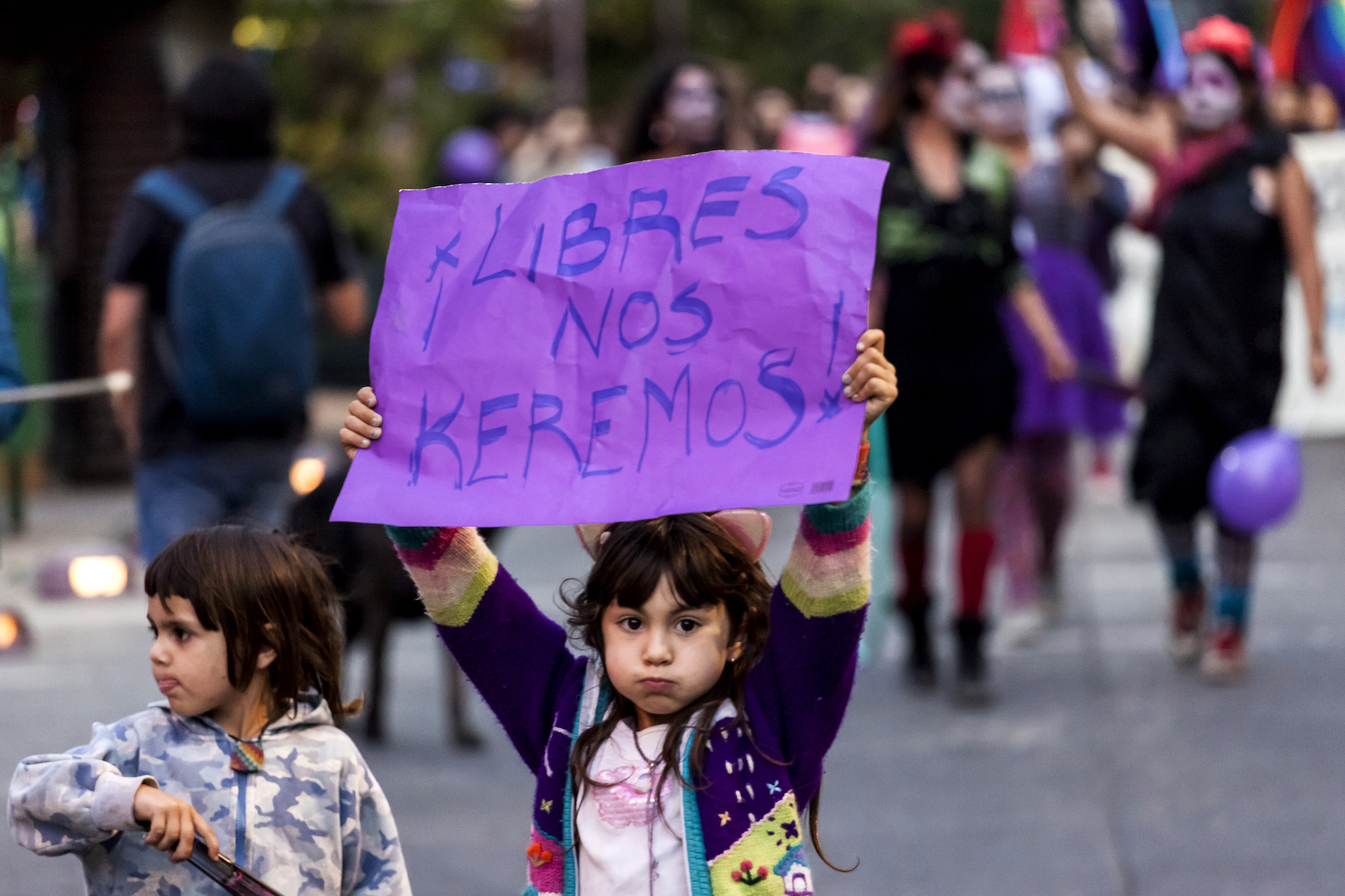 A child carries a sign during International Women’s Day protest on March 8, 2018 in Osorno, Chile. (Photo by Fernando Lavoz/NurPhoto)