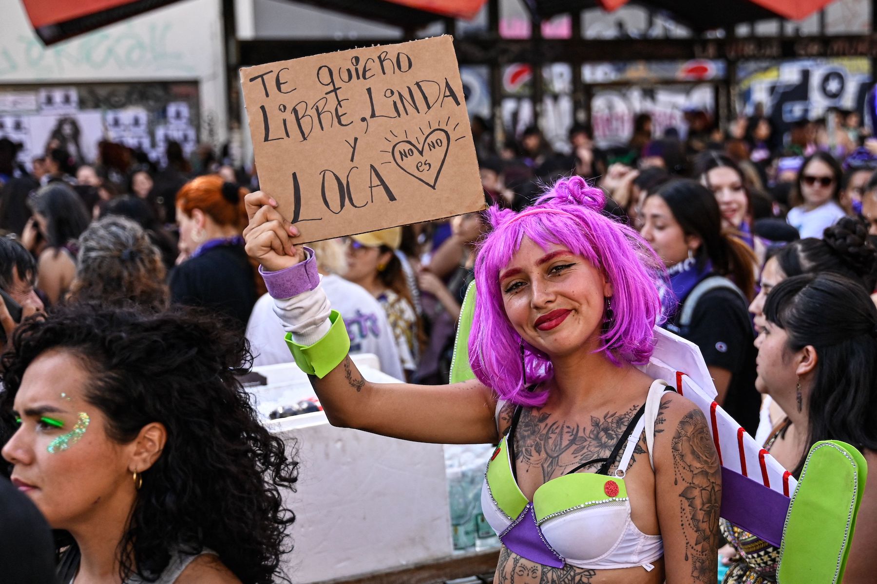 A demonstrator holds a sign during a march in support of women’s rights in the framework of International Women’s Day, in Santiago on March 8, 2023. (Photo by MARTIN BERNETTI/AFP via Getty Images)