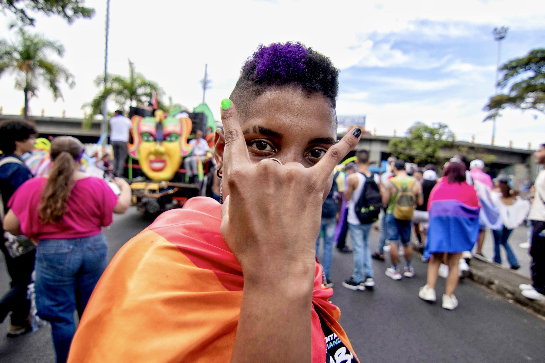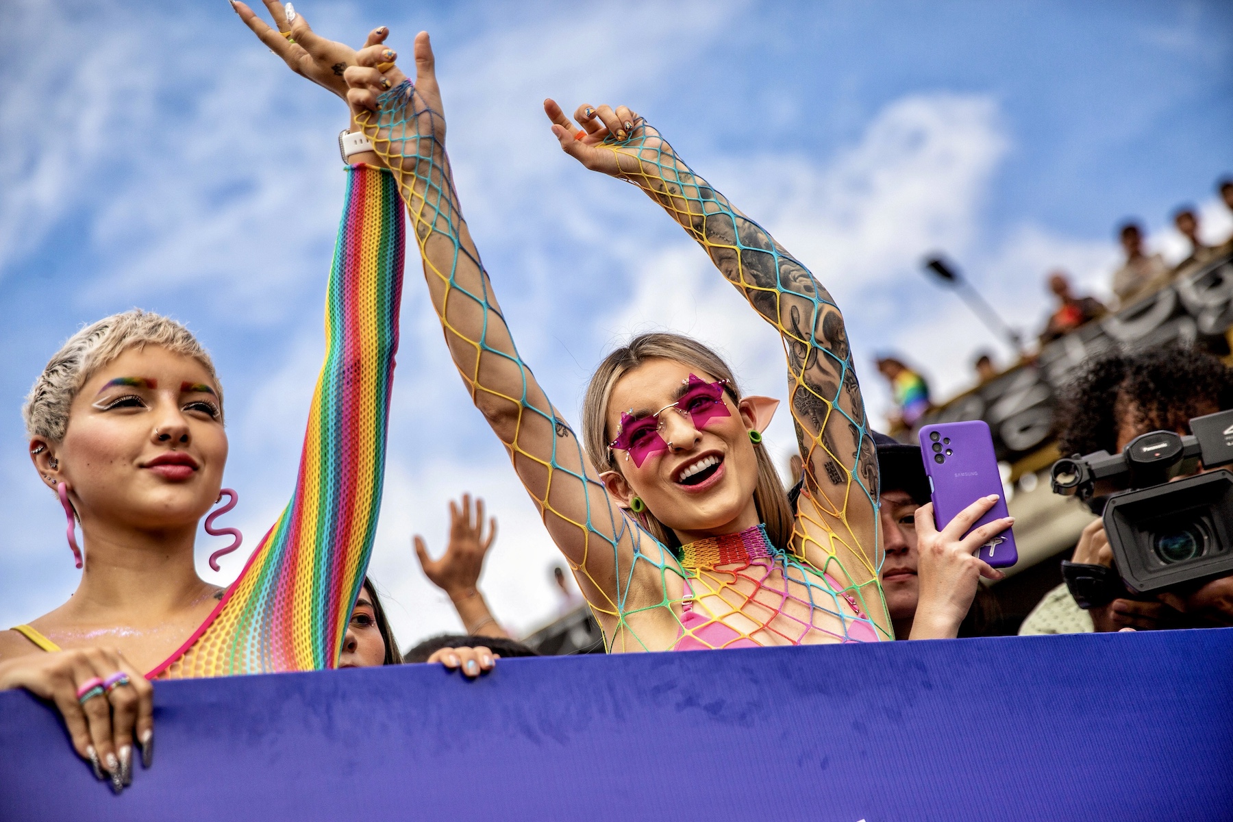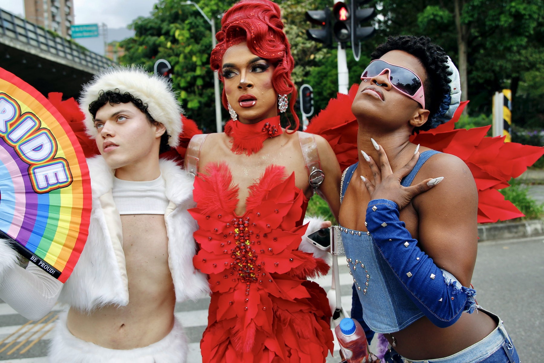 Participants pose during the 2023 Medellin Pride Parade on July 02, 2023 in Medellin, Colombia. (Photo by Fredy Builes/Getty Images)
