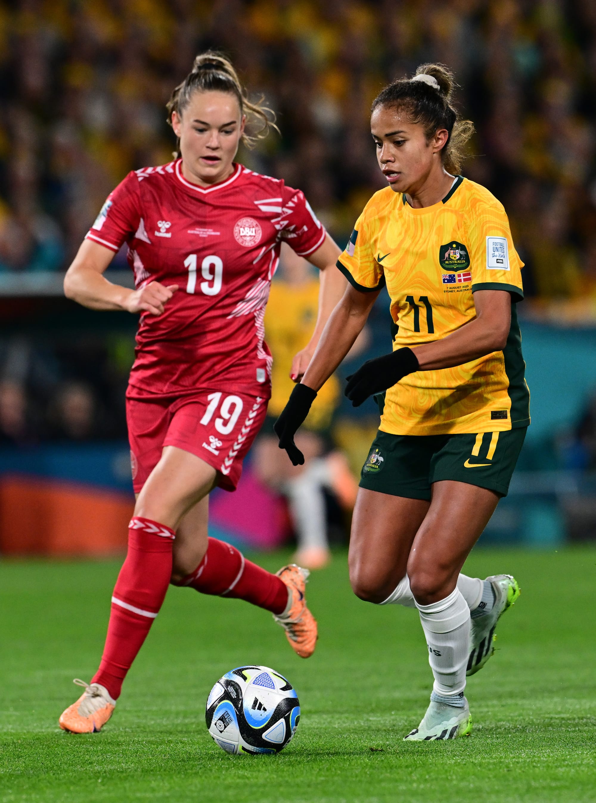 Janni Bøgild Thomsen (L) of the Denmark women soccer team and Mary Boio Fowler (R) of the Australia women soccer team seen in action during the FIFA Women's World Cup 2023. (Photo by Luis Veniegra/SOPA Images/LightRocket via Getty Images)