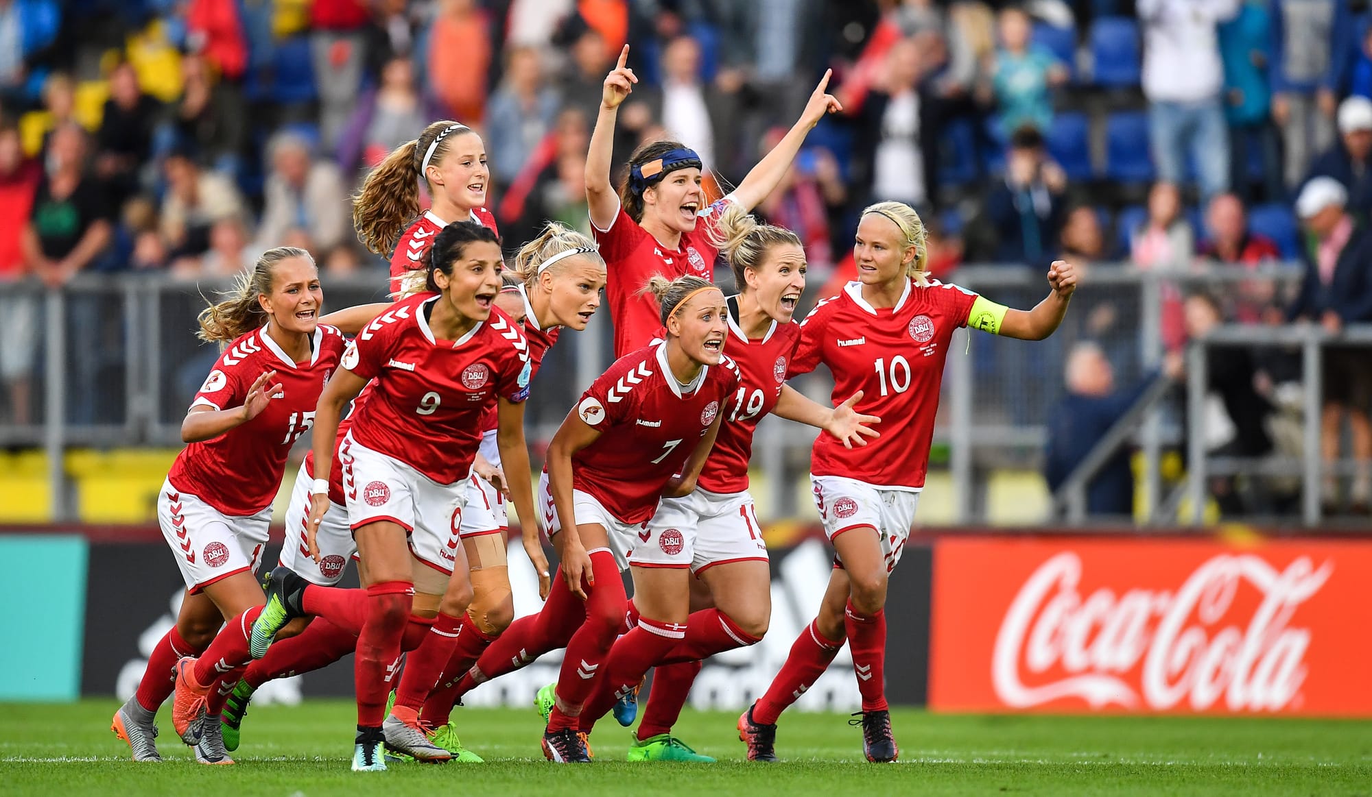 Denmark players celebrate winning the penalty shoot-out during the UEFA Women's EURO 2017 Semi-final match between Austria and Denmark at Rat Verlegh Stadion. (Photo by Brendan Moran - UEFA/UEFA via Getty Images)