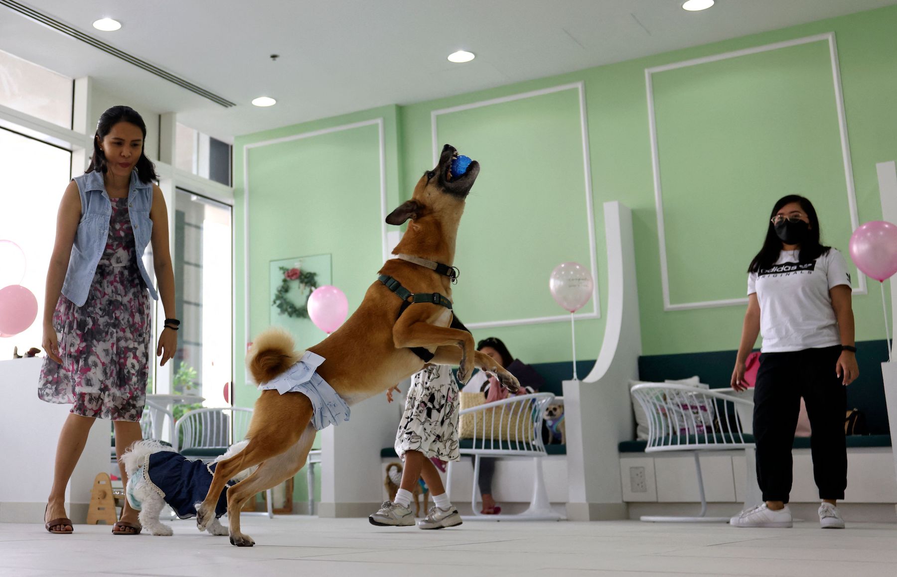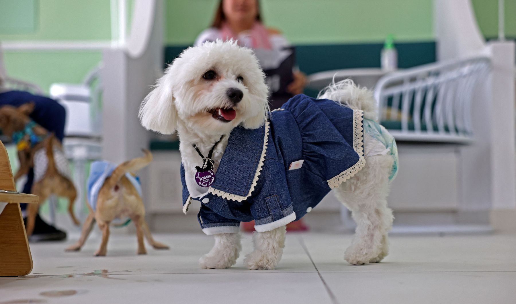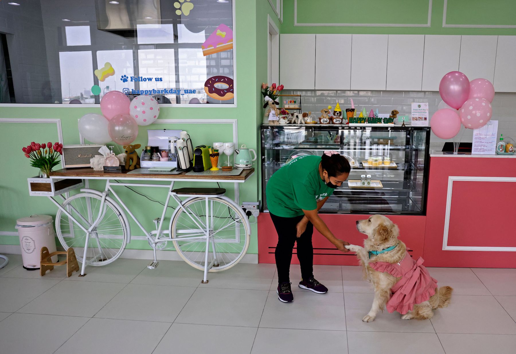 A staff member at Happy Bark Day, the first dog cafe in the Gulf emirate of Dubai to serve food, coffee, and cake to dogs only, welcomes a customer on May 30, 2022. (Photo by KARIM SAHIB/AFP via Getty Images)