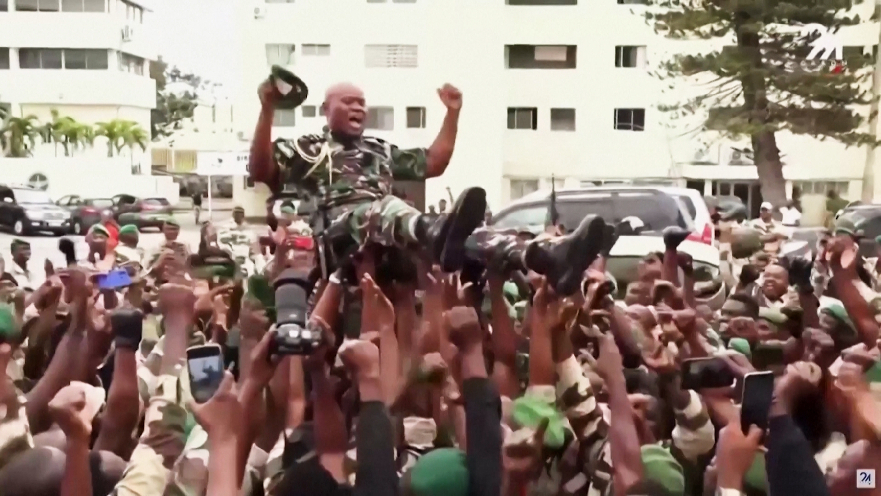 He was seen being carried triumphantly by his troops through the streets of Libreville.