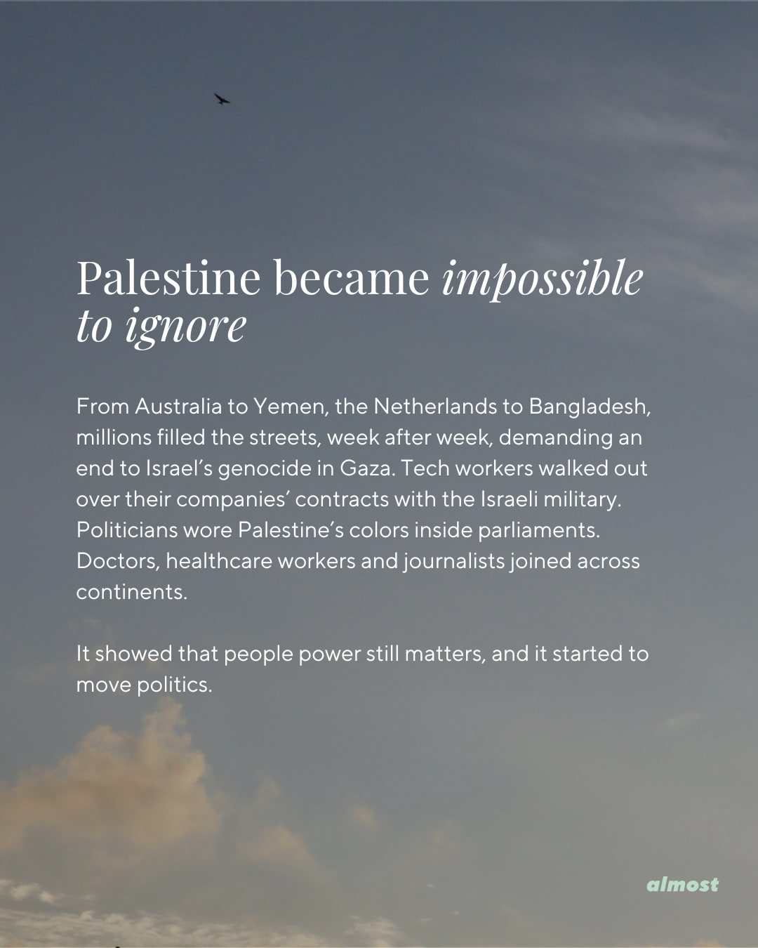 From Australia to Yemen, the Netherlands to Bangladesh, millions filled the streets, week after week, demanding an end to Israel’s genocide in Gaza. Tech workers walked out over their companies’ contracts with the Israeli military. Politicians wore Palestine’s colors inside parliaments. Doctors, healthcare workers and journalists joined across continents.