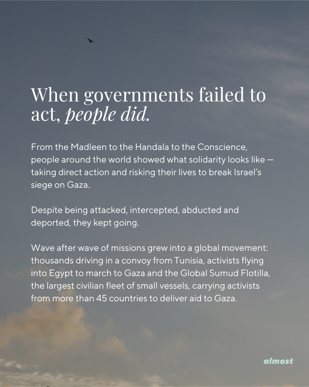 Wave after wave of missions grew into a global movement: thousands driving in a convoy from Tunisia, activists flying into Egypt to march to Gaza and the Global Sumud Flotilla, the largest civilian fleet of small vessels, carrying activists from more than 45 countries to deliver aid to Gaza.