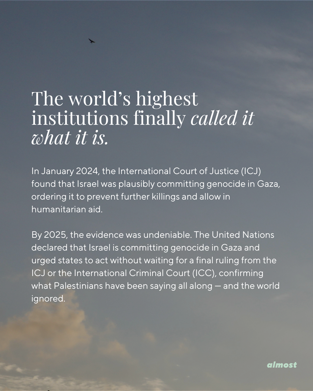 By 2025, the evidence was undeniable. The United Nations declared that Israel is committing genocide in Gaza and urged states to act without waiting for a final ruling from the ICJ or the International Criminal Court (ICC), confirming what Palestinians have been saying all along — and the world ignored.