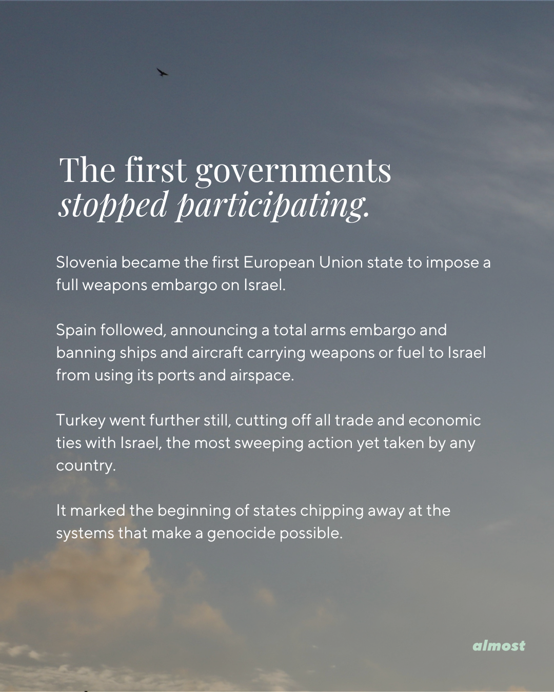 Spain followed, announcing a total arms embargo and banning ships and aircraft carrying weapons or fuel to Israel from using its ports and airspace.