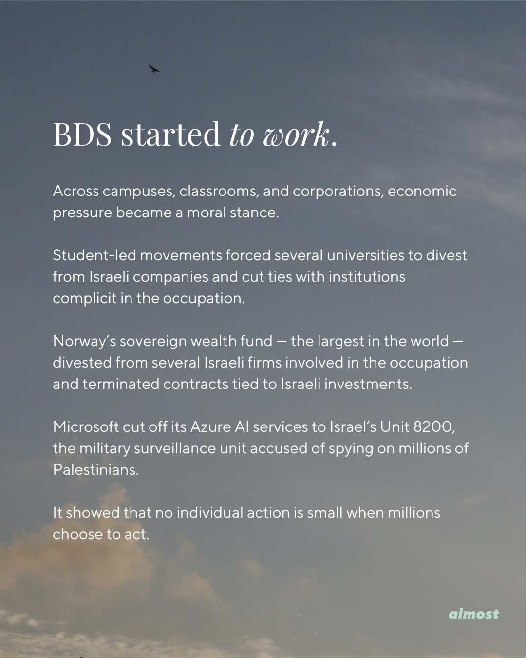 Student-led movements forced several universities to divest from Israeli companies and cut ties with institutions complicit in the occupation.