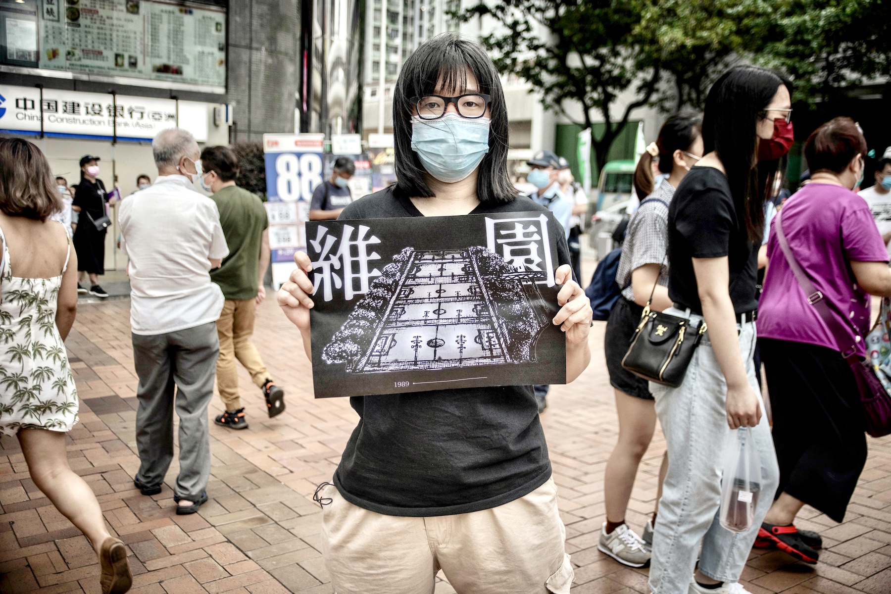 Chow Hang Tung, vice chairman of the Hong Kong Alliance in Support of Patriotic Democratic Movements of China, holds a poster at a sidewalk booth showcasing the 1989 Tiananmen Square crackdown in Hong Kong, on May 29, 2021. (Photographer: Ivan Abreu/Bloomberg)