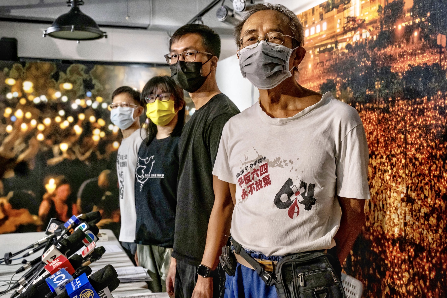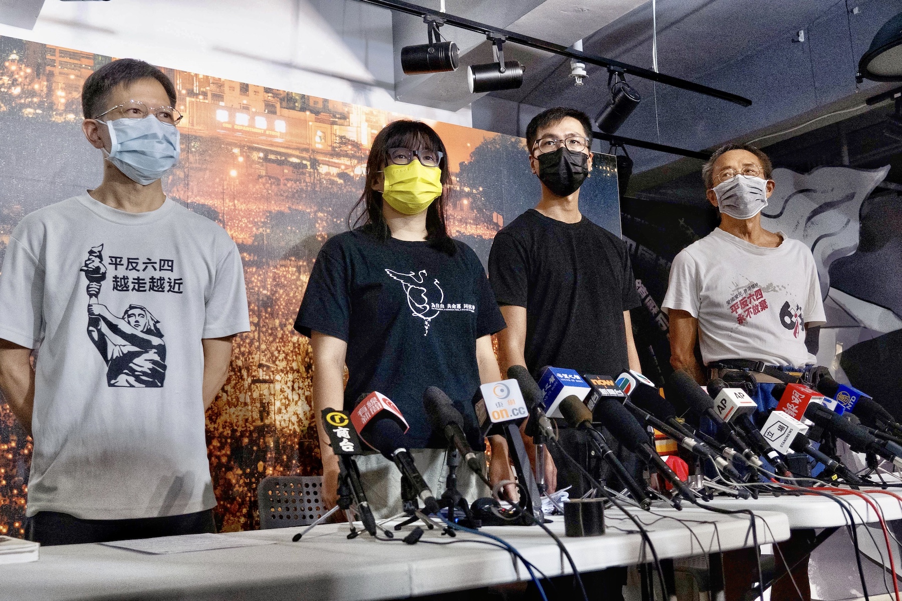 The Hong Kong Alliance in Support of Patriotic Democratic Movements of China standing committee members (from L-R) Tang Ngok-kwan, Chow Hang-tung, Simon Leung Kam-wai and Tsui Hon-kwong attend a press conference at the June 4th Museum in Hong Kong on September 5, 2021, announcing they will not submit any documents to the police’s National Security Department and to hold an upcoming meeting to vote on dissolution. (Photo by BERTHA WANG/AFP via Getty Images)