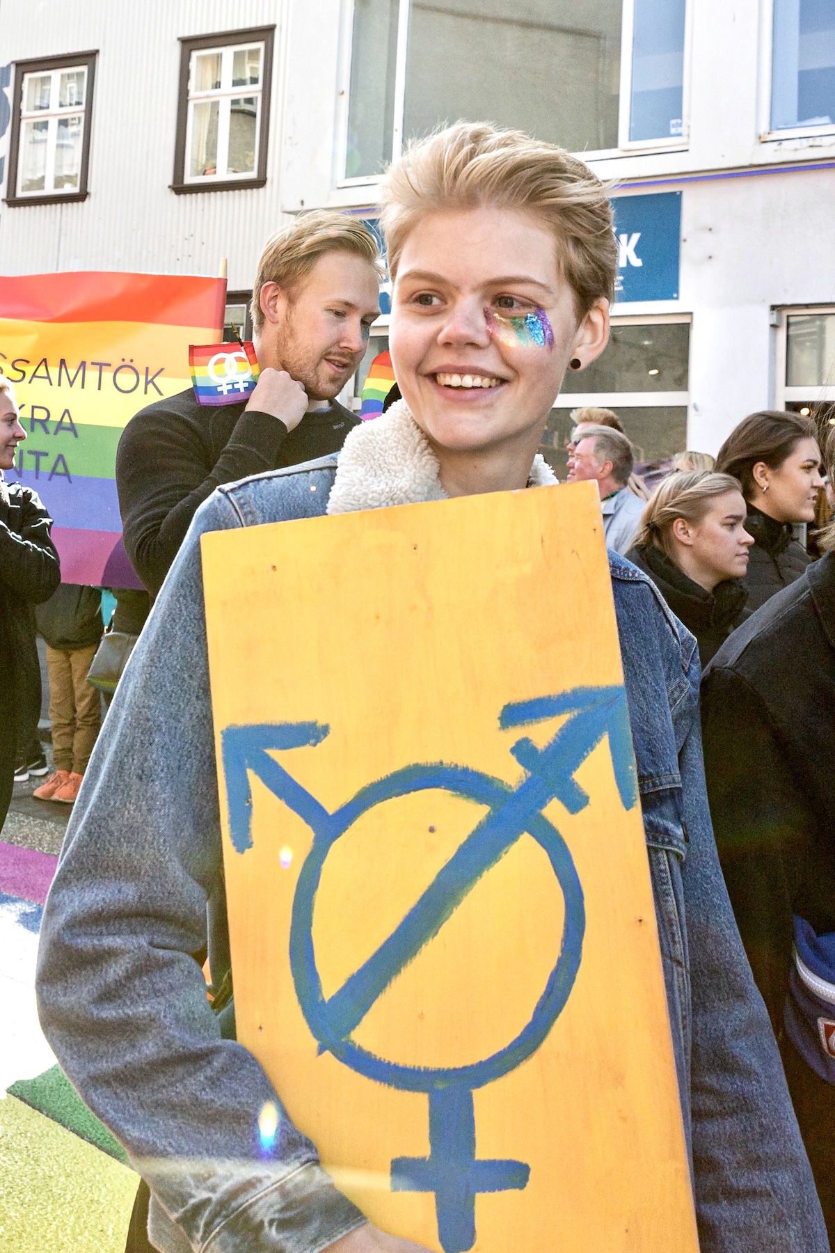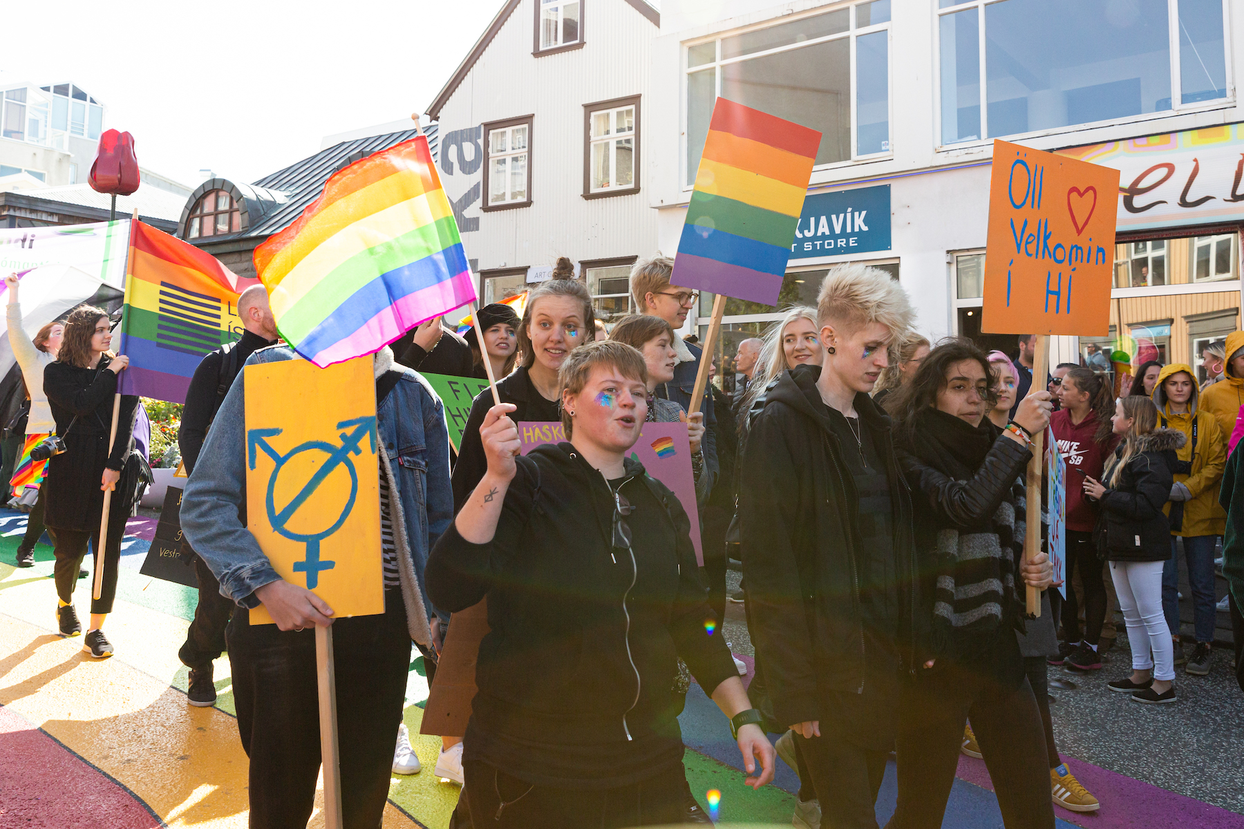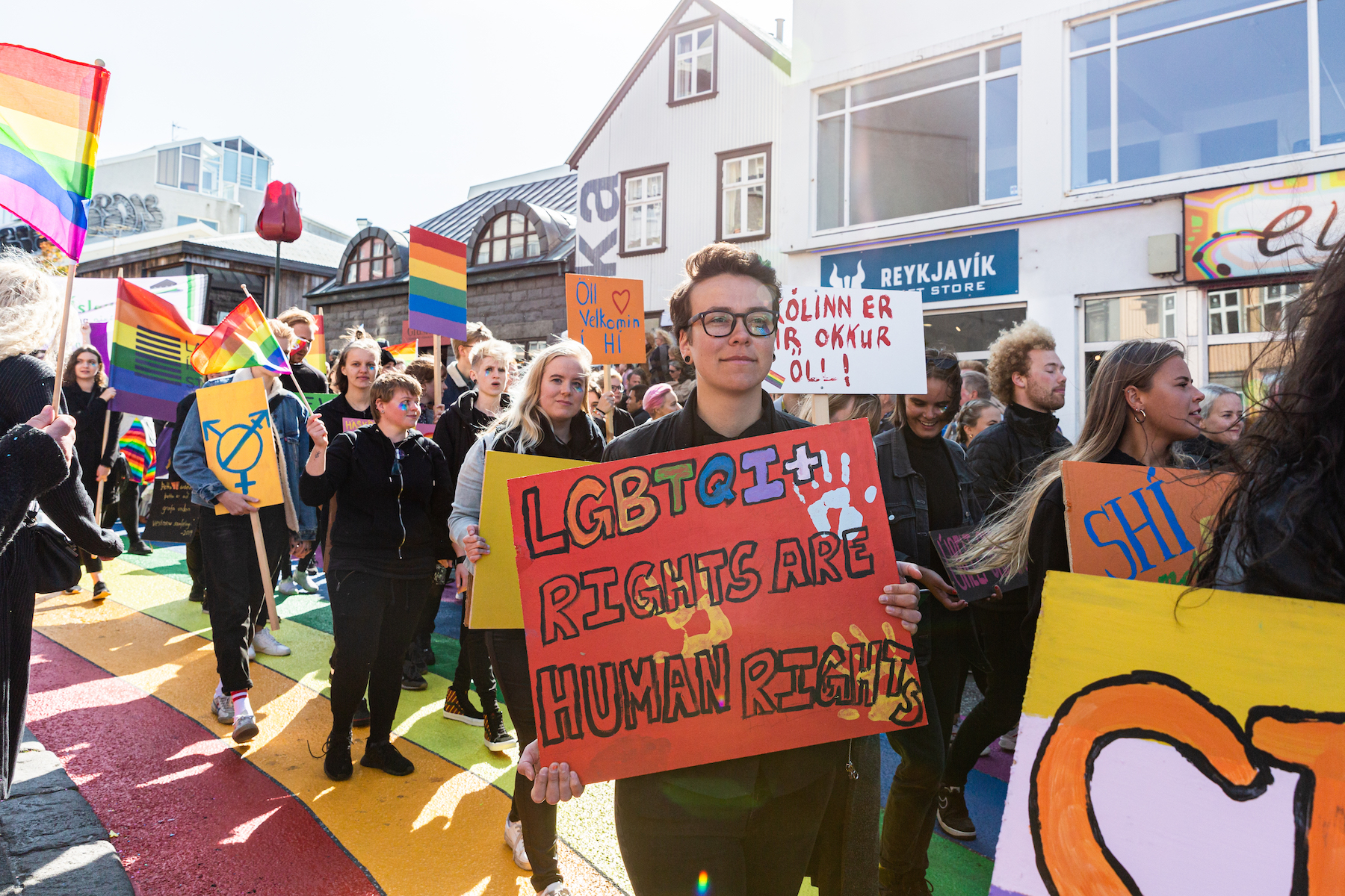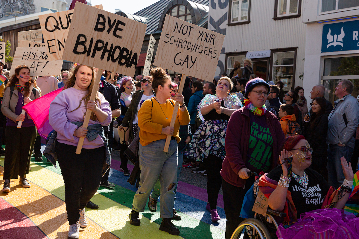 Participants hold signs during the Reykjavík Pride parade on August 17, 2019 in Reykjavik, Iceland. (Photo by Sophia Groves/Getty Images)