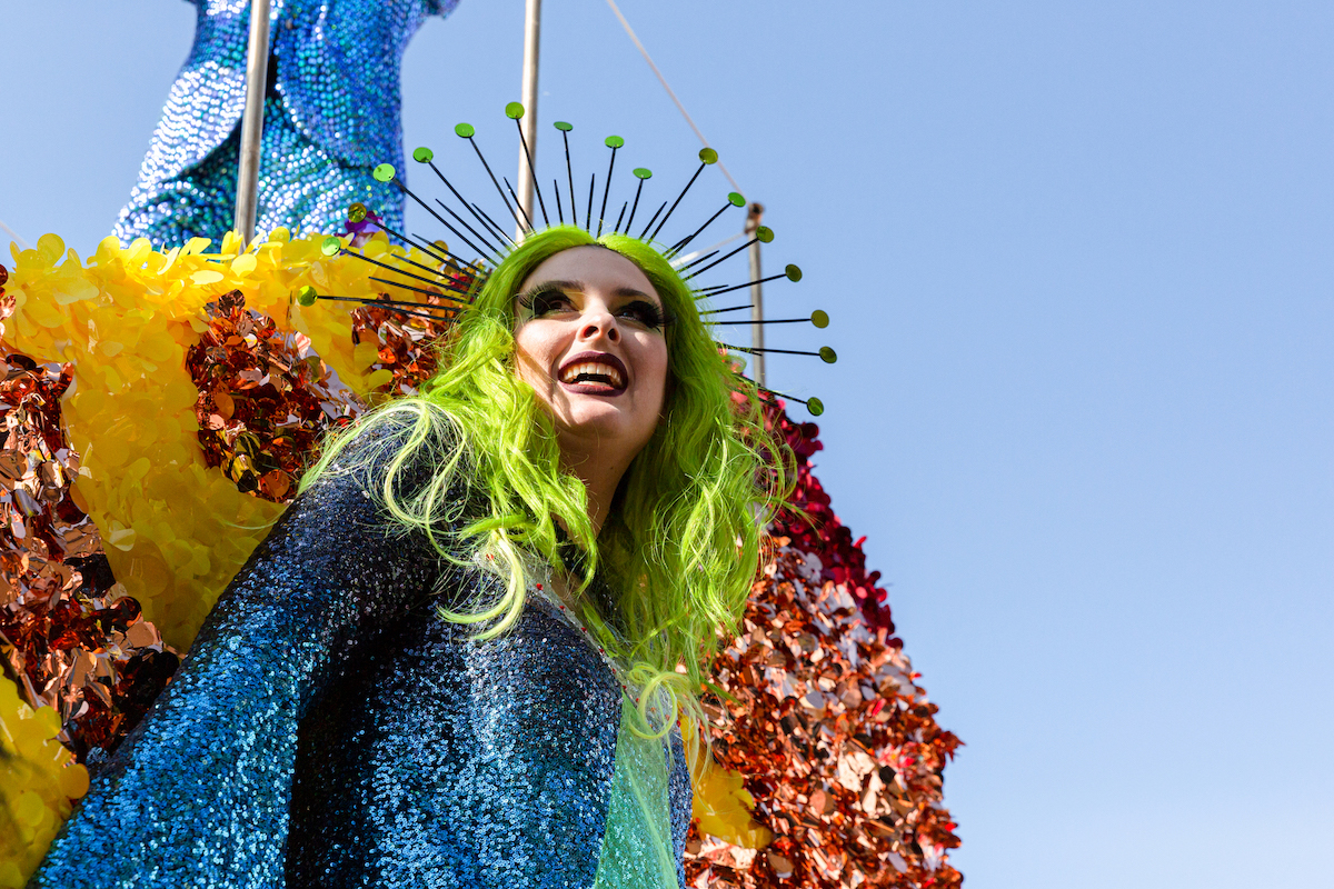 A drag queen smiles at the crowd during the Reykjavík Pride parade on August 17, 2019 in Reykjavik, Iceland. (Photo by Sophia Groves/Getty Images)