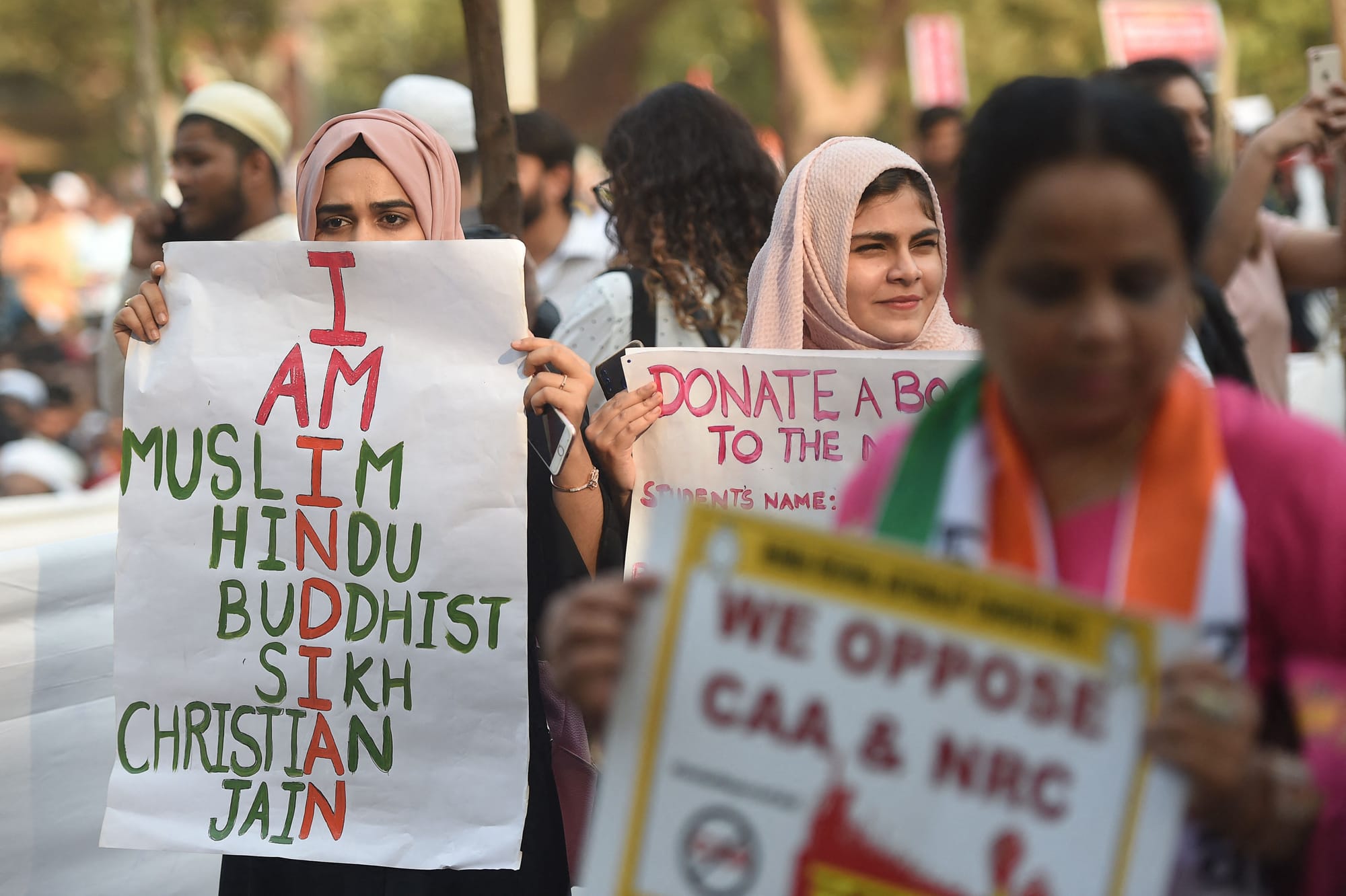 Protesters hold placards at a demonstration against India's new citizenship law in Mumbai on December 19, 2019. (Photo by PUNIT PARANJPE/AFP via Getty Images)