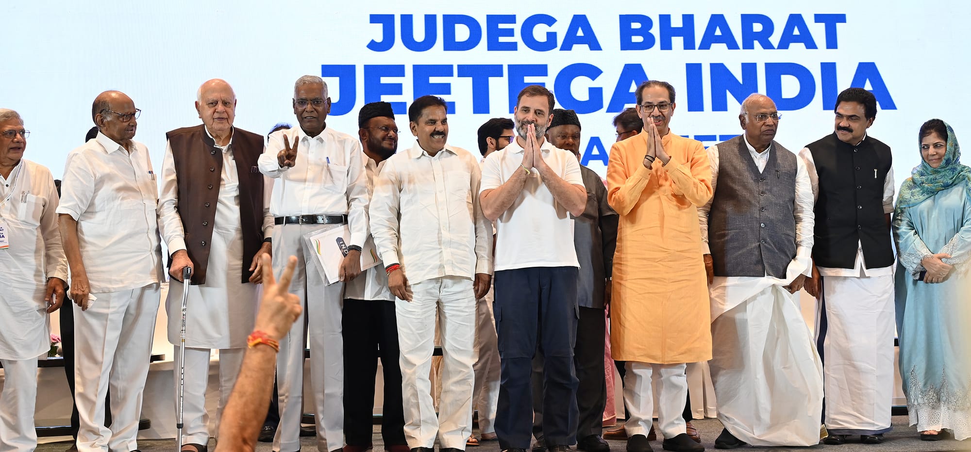 Congress leaders Rahul Gandhi and Mallikarjun Kharge during press conference of INDIA alliance in Mumbai on 1st September 2023. Photo by Mandar Deodhar