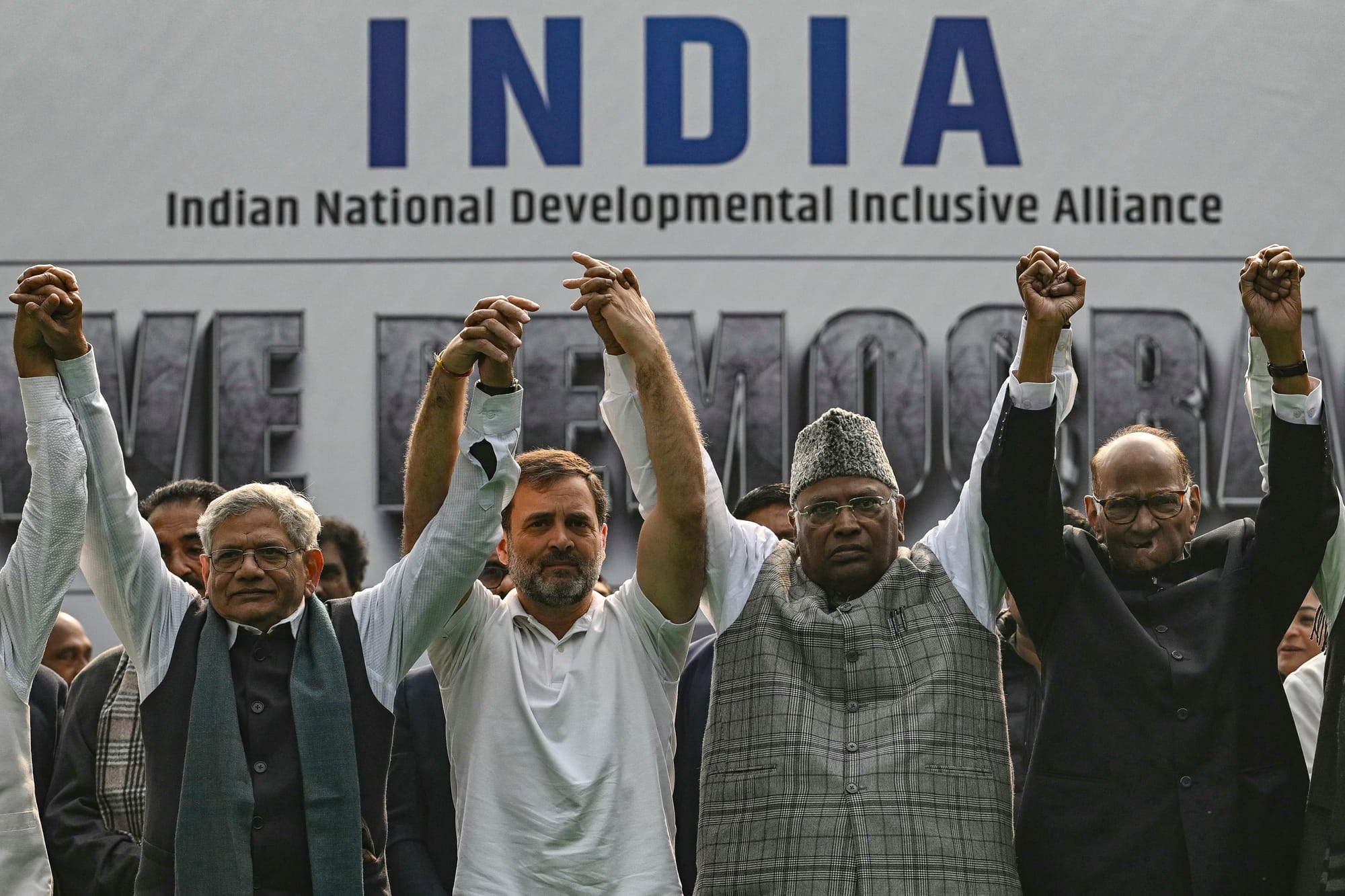 India's Congress party leader Rahul Gandhi (2L) and president Mallikarjun Kharge (2R) along with other members of parliament take part in a protest in New Delhi on December 22, 2023.(Photo by Arun SANKAR / AFP)