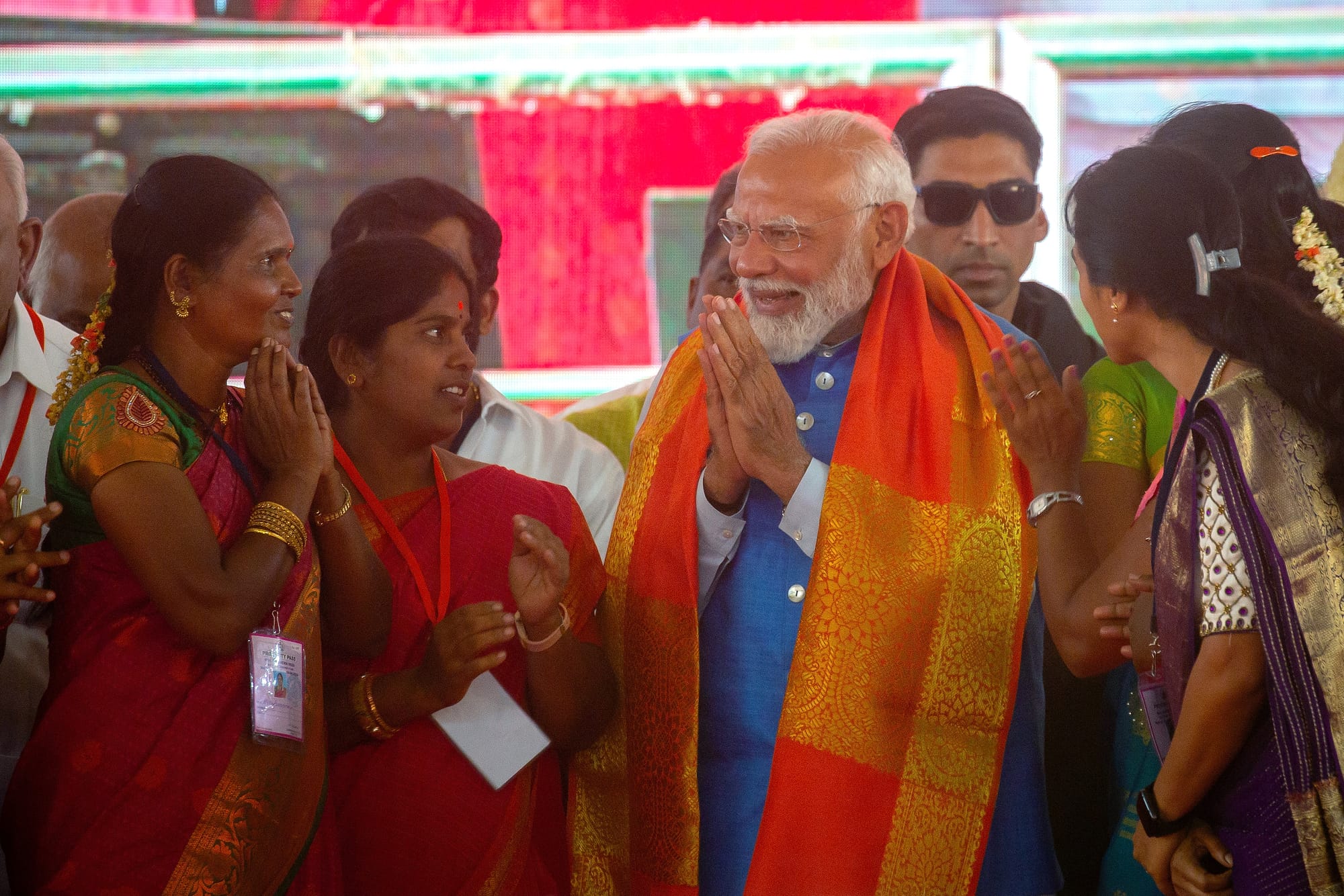 Prime Minister Narendra Modi greets women during an election campaign rally on April 14, 2024 in Mysuru, India. (Photo by Abhishek Chinnappa/Getty Images)
