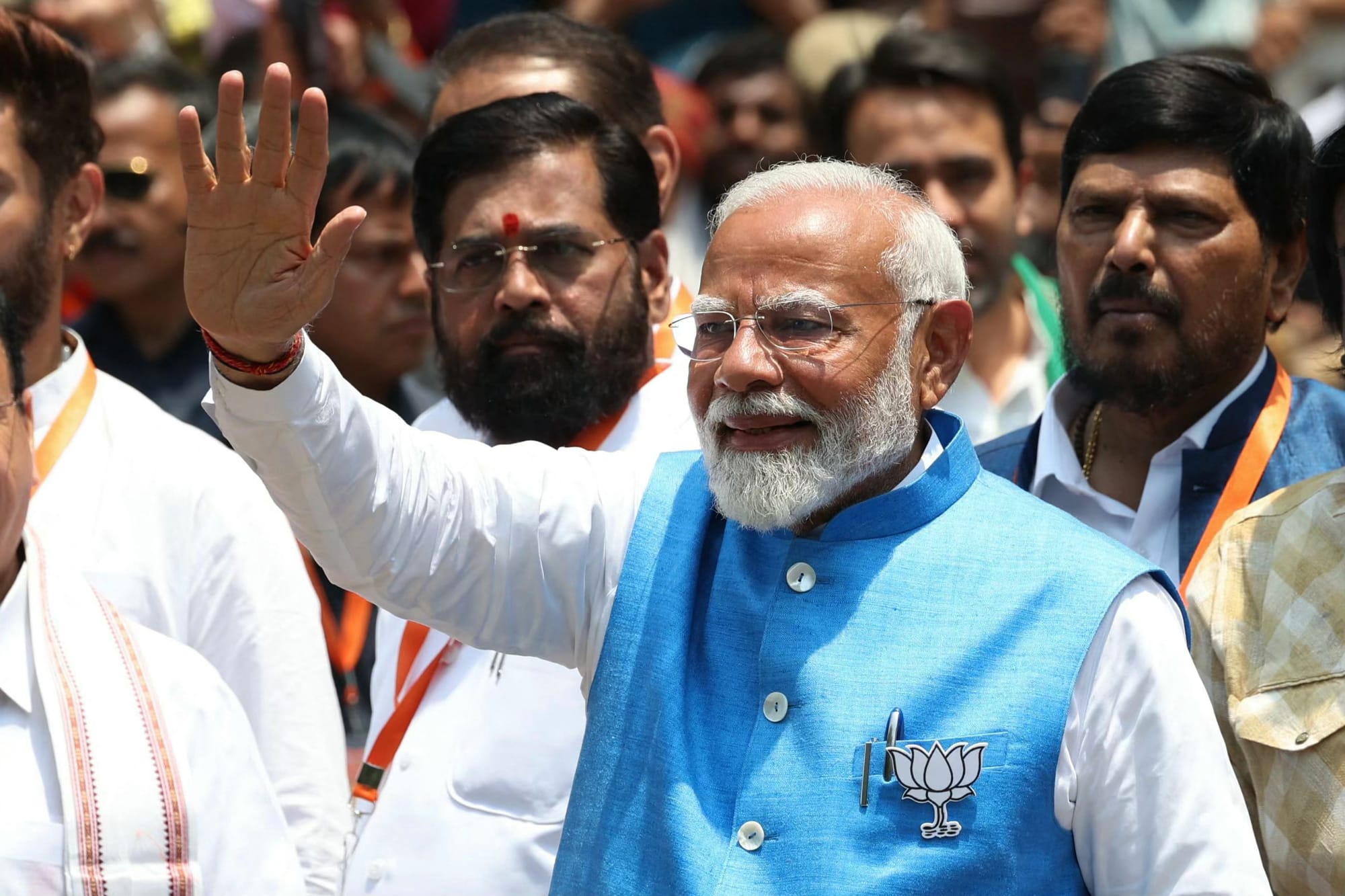 ndian Prime minister Narendra Modi waves towards supporters during his roadshow on May 13 2024 in Varanasi, India. (Photo by Ritesh Shukla/Getty Images)