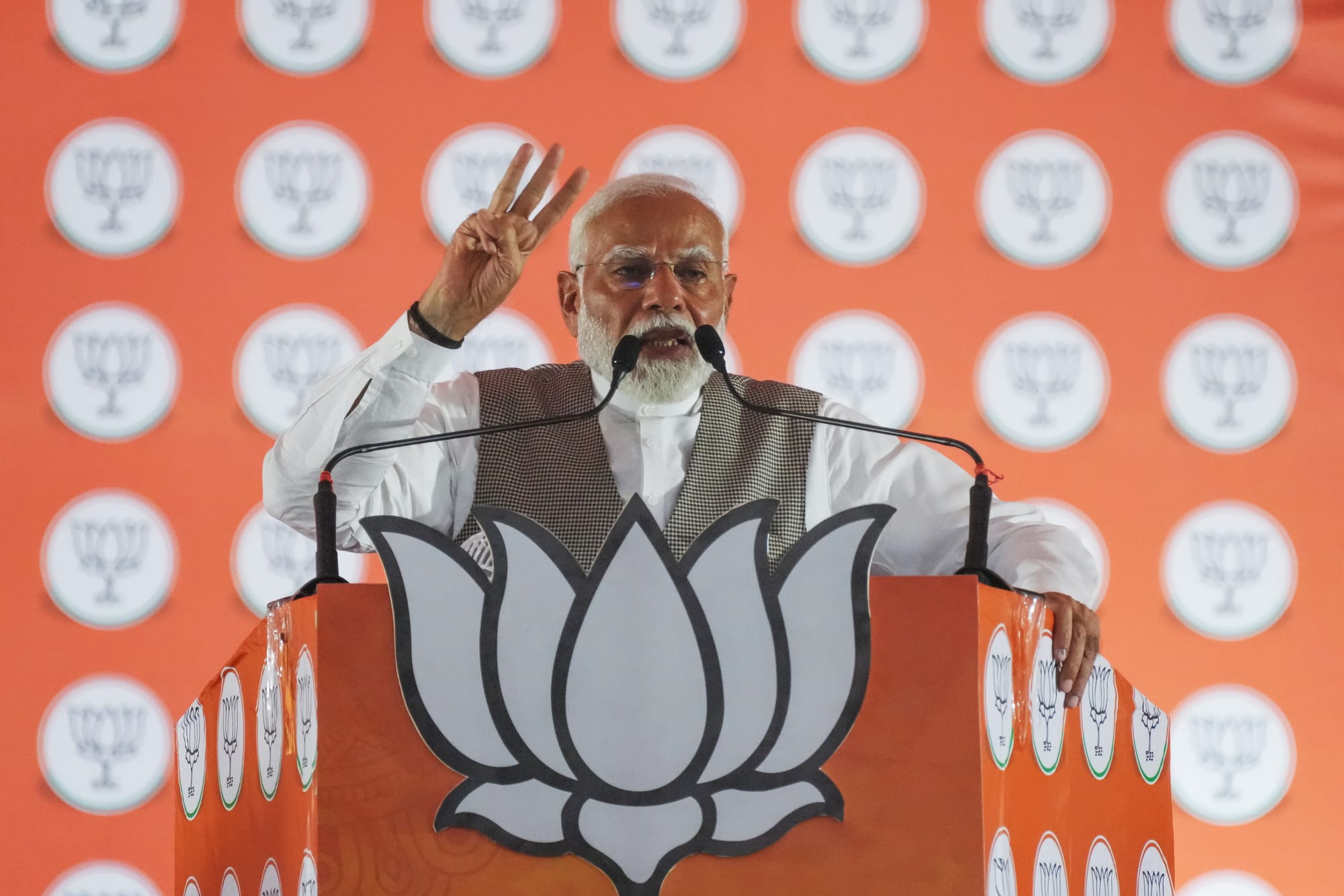 Prime Minister Narendra Modi gestures while addressing his supporters during an election campaign rally in India (Photo by Debajyoti Chakraborty/NurPhoto via Getty Images)