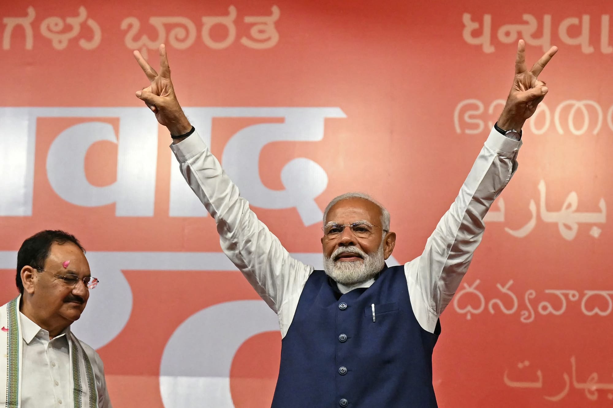 India’s Prime Minister Narendra Modi (R) flashes victory sign as Bharatiya Janata Party (BJP) President Jagat Prakash Nadda (L) looks on during the celebrations after their victory in India's general election. (Photo by Money SHARMA / AFP)
