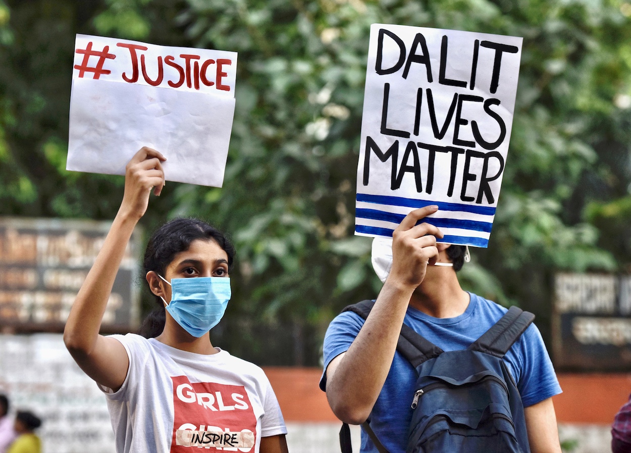 Activists hold placards during a protest to condemn the alleged gang-rape and murder of a 19-year-old woman in Bool Garhi village of Uttar Pradesh state, in Mumbai on October 6, 2020. (Photo by PUNIT PARANJPE/AFP via Getty Images)