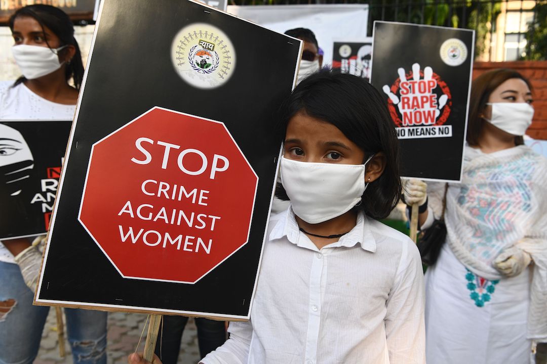 A volunteer from a non-governmental organisation (NGO) holds a placard during a protest in New Delhi on October 11, 2020 to condemn the alleged gang-rape and murder of a teenaged woman in Bool Garhi village at Hathras in Uttar Pradesh state. (Photo by SAJJAD HUSSAIN/AFP via Getty Images)