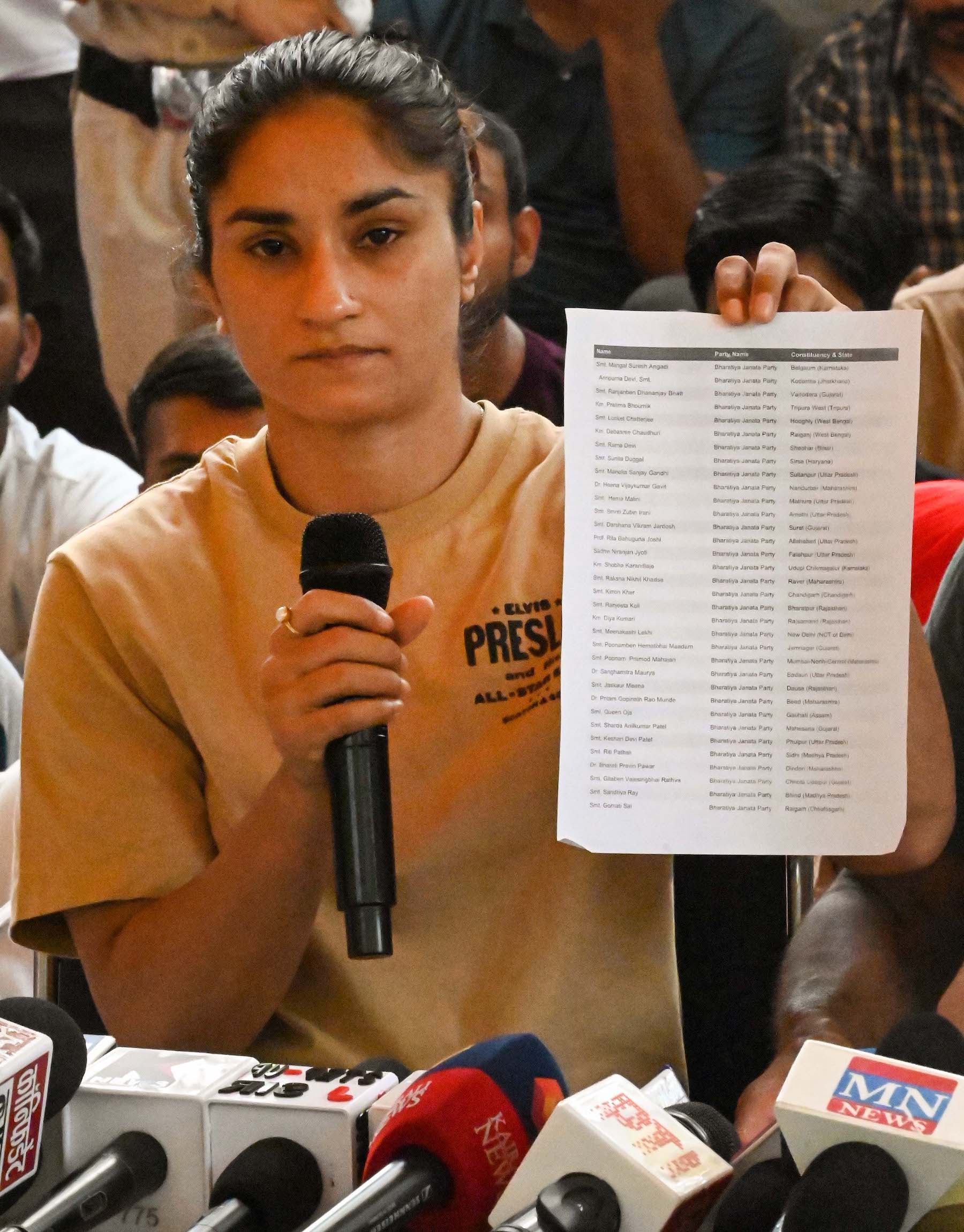 Wrestler Vinesh Phogat showing a letter wrestlers have written to the Women BJP MP’s to come and support them during the press conference at Jantar Mantar, on May 14, 2023 in New Delhi, India. (Photo by Vipin Kumar/Hindustan Times via Getty Images)