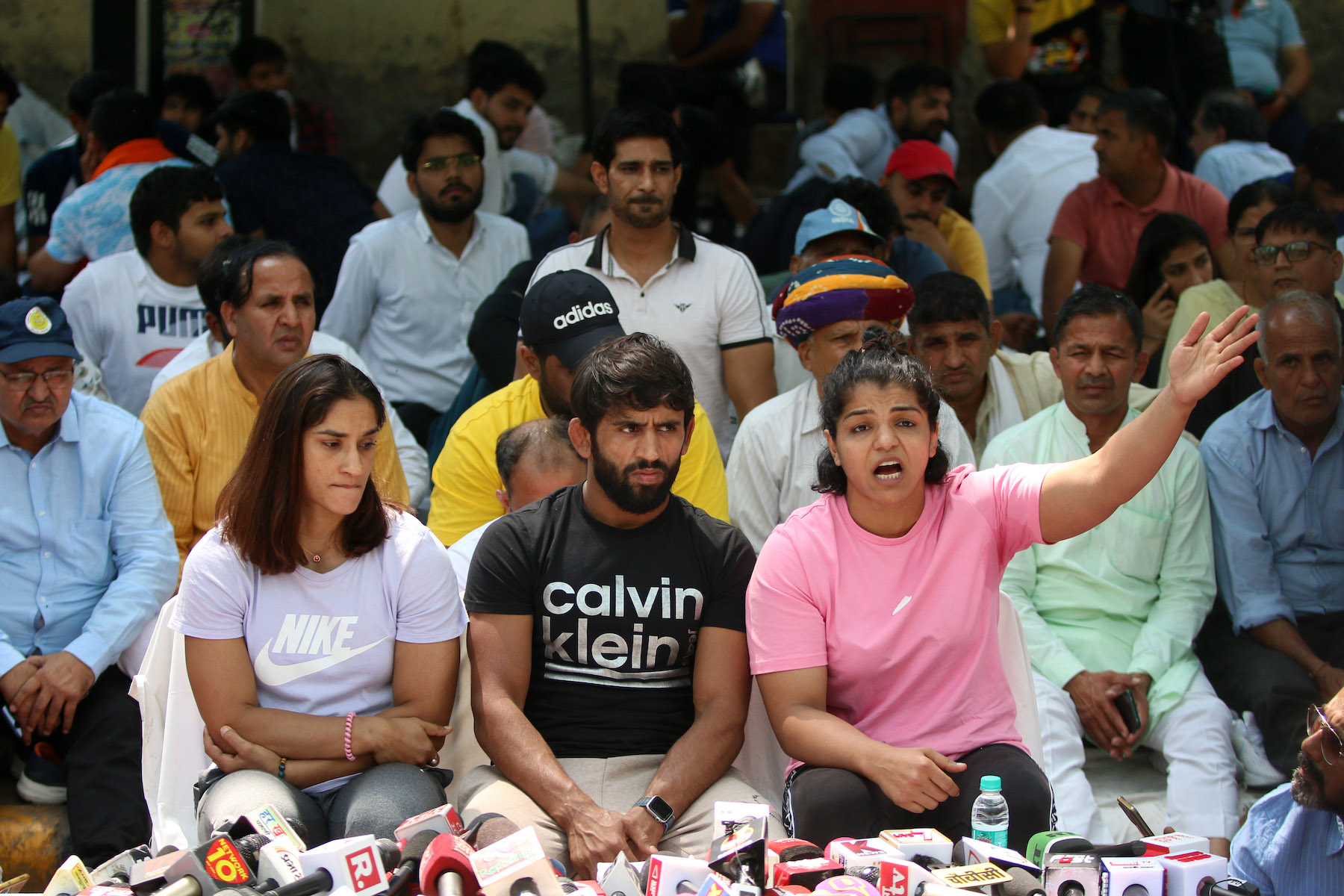 Wrestlers Bajrang Punia, Vinesh Phogat and Sakshi Malik, during a protest against Wrestling Federation of India President Brij Bhushan Sharan Singh over alleged sexual harassment, at Jantar Mantaron April 24, 2023 in New Delhi, India.(Photo by Salman Ali/Hindustan Times via Getty Images)