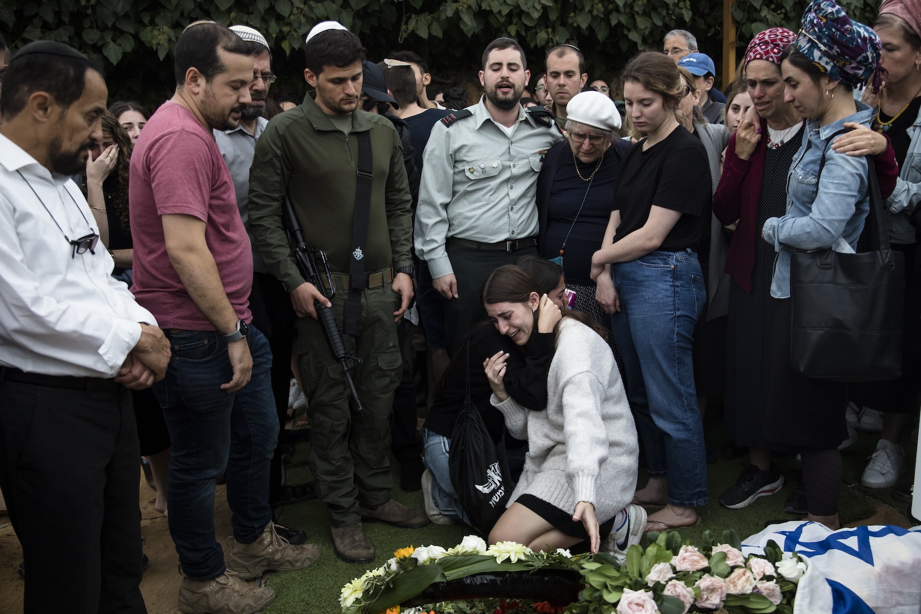 Naama Doplet (sitting) joined by family members and friends mourns the loss of her fiance, Israeli soldier Capt. Kafir Yitzhak Franco during his funeral in Jerusalem. (Photo by Amir Levy/Getty Images)