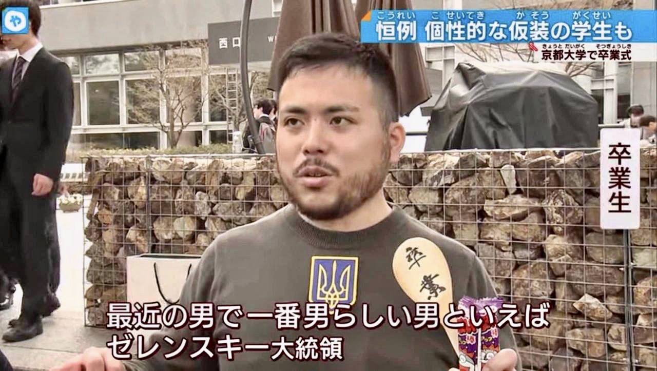 The student at Kyoto University, later identified as Twitter user LohoG29i, wore Zelensky’s signature olive-green sweatshirt, which the president has been wearing since the Russian invasion, with a Ukrainian symbol on it to the graduation ceremony on Friday March 24.