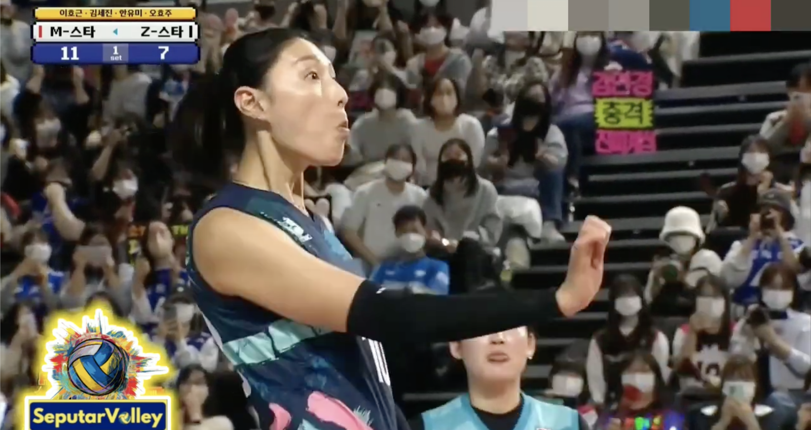 To everyone’s surprise, a player from the opposing team, Kim Yeon-koung, also known as the “Queen of Volleyball” and the former Captain of South Korea’s National Team, then responded with her own dance to the delight of the fans.