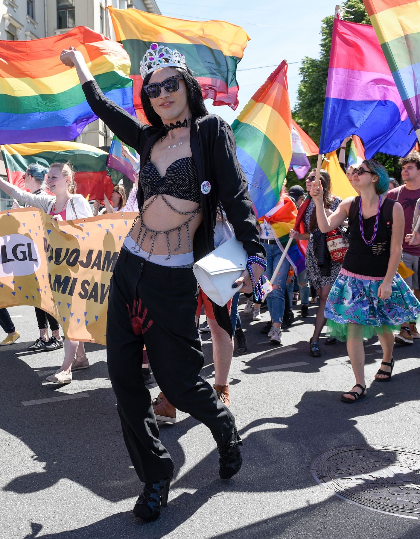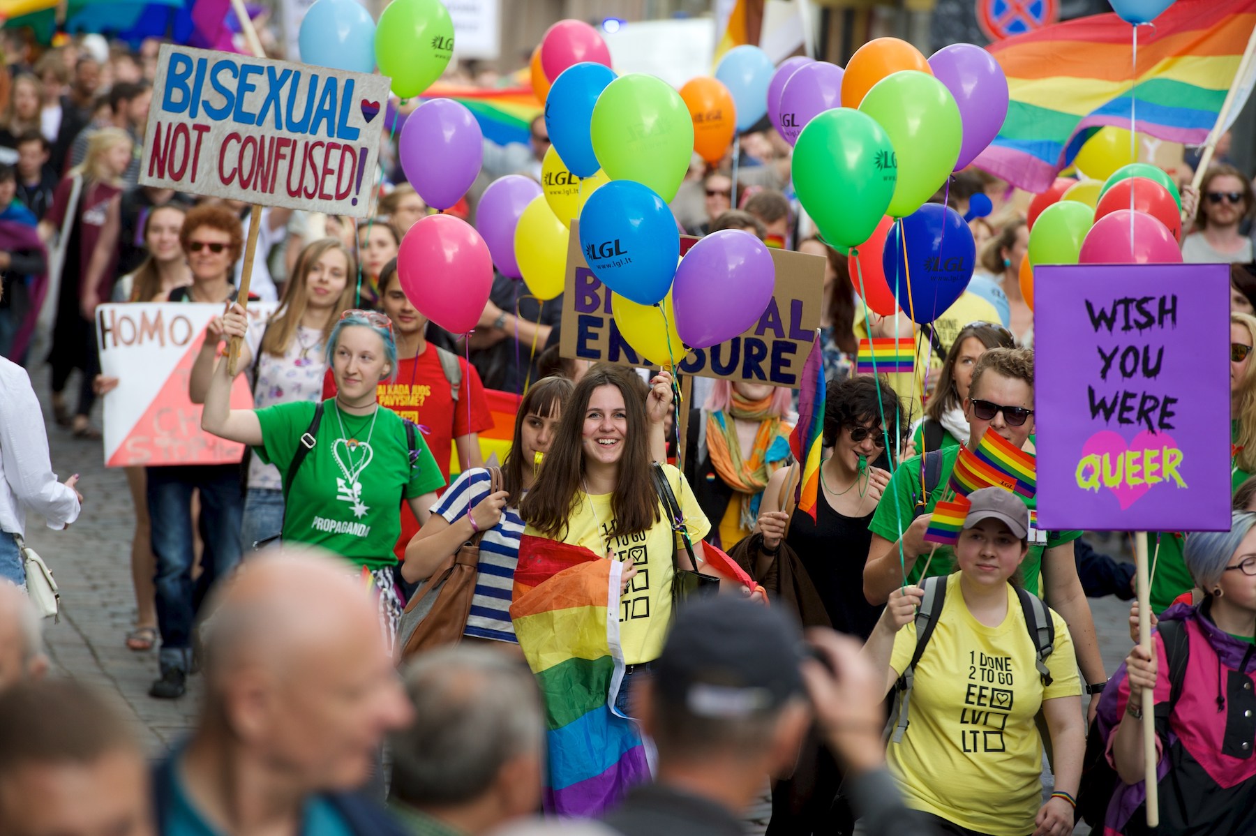 Participants walk through the streets of Riga, Latvia, during the Europride 2015 parade of lesbian, gay, bisexual and transgender (LGBT) people on June 20, 2015. (Photo by ILMARS ZNOTINS/AFP via Getty Images)