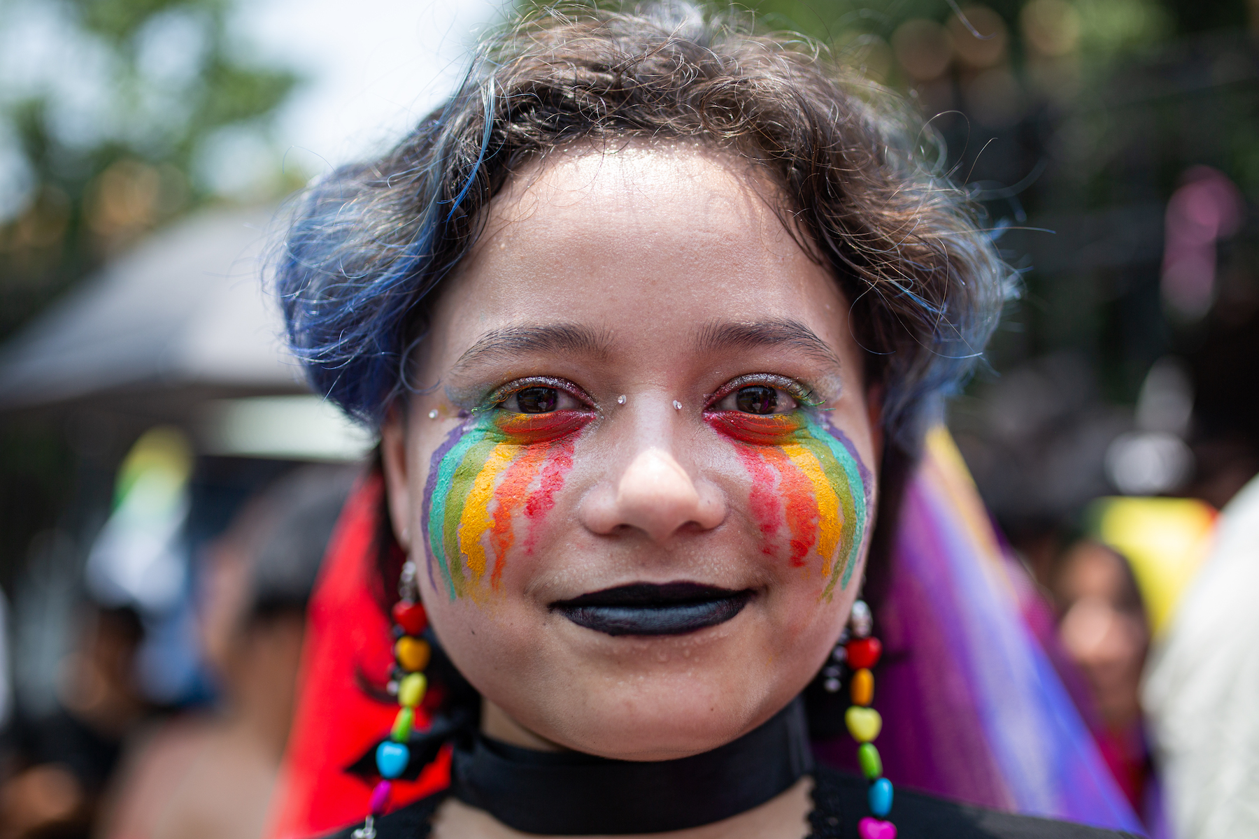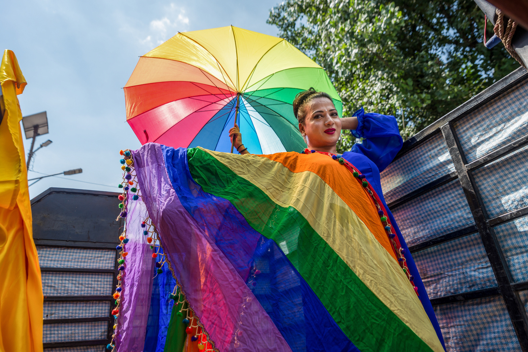 KATHMANDU, NEPAL – 2022/08/12: Nepalese reveler poses with a rainbow umbrella and shawl during the pride parade of LGBTQIA (lesbian, gay, bisexual, queer, intersexual, transgender, asexual). People from LGBTQIA gathered and attended the parade to display their presence in society. (Photo by Bivas Shrestha/SOPA Images/LightRocket via Getty Images)