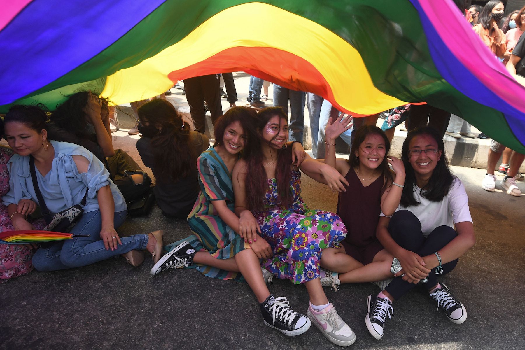 Members of the Lesbian, Gay, Bisexual, Transgender, Intersex and Queer (LGBTIQ+) community sit under a rainbow flag during a Pride Parade in Kathmandu on June 11, 2022. (Photo by PRAKASH MATHEMA / AFP) (Photo by PRAKASH MATHEMA/AFP via Getty Images)
