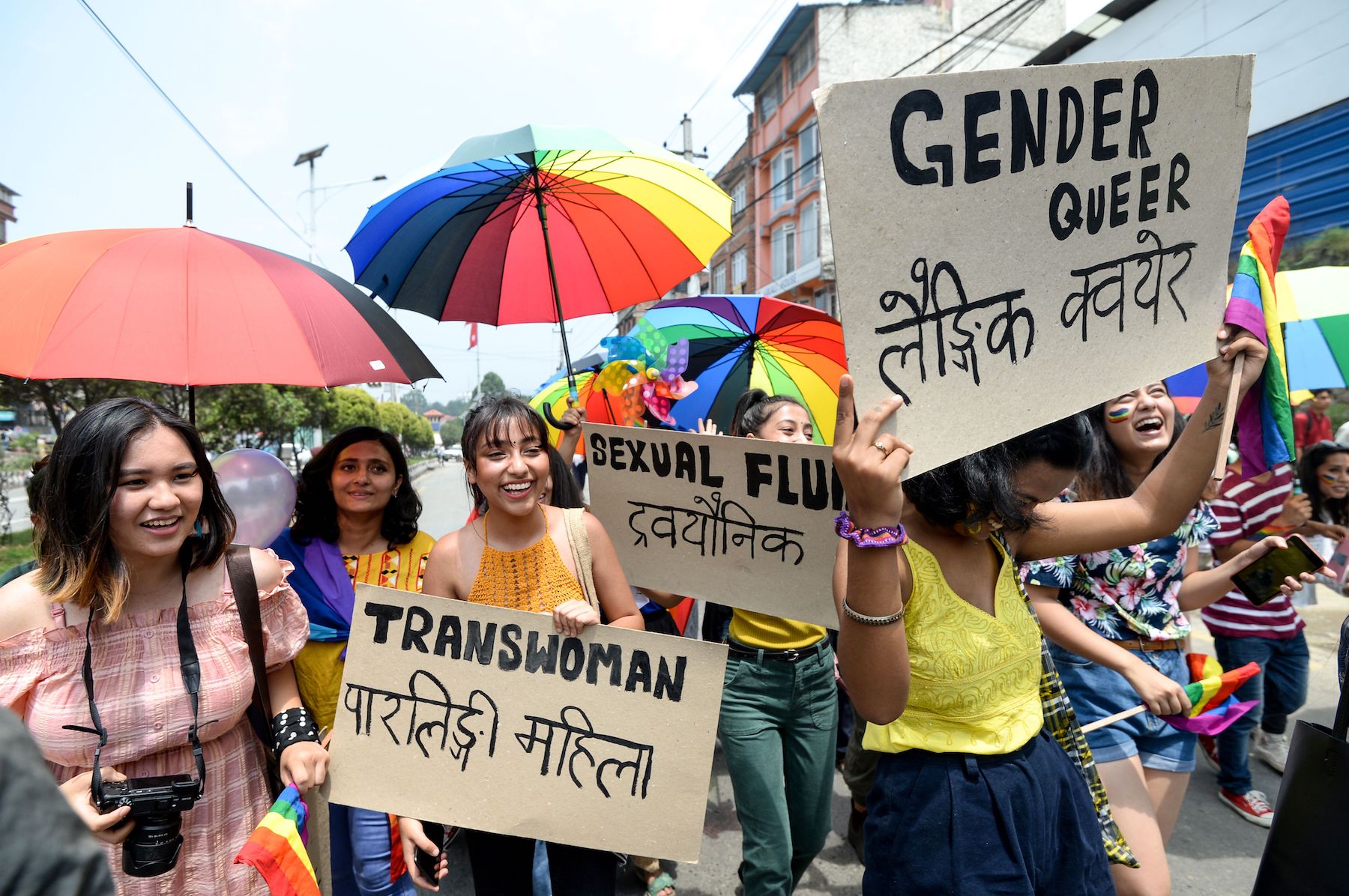 Members of Nepal’s Lesbian, Gay, Bisexual and Transgender (LGBT) community take part in a Pride Parade in Kathmandu on August 16, 2019. (Photo by PRAKASH MATHEMA / AFP) (Photo credit should read PRAKASH MATHEMA/AFP via Getty Images)