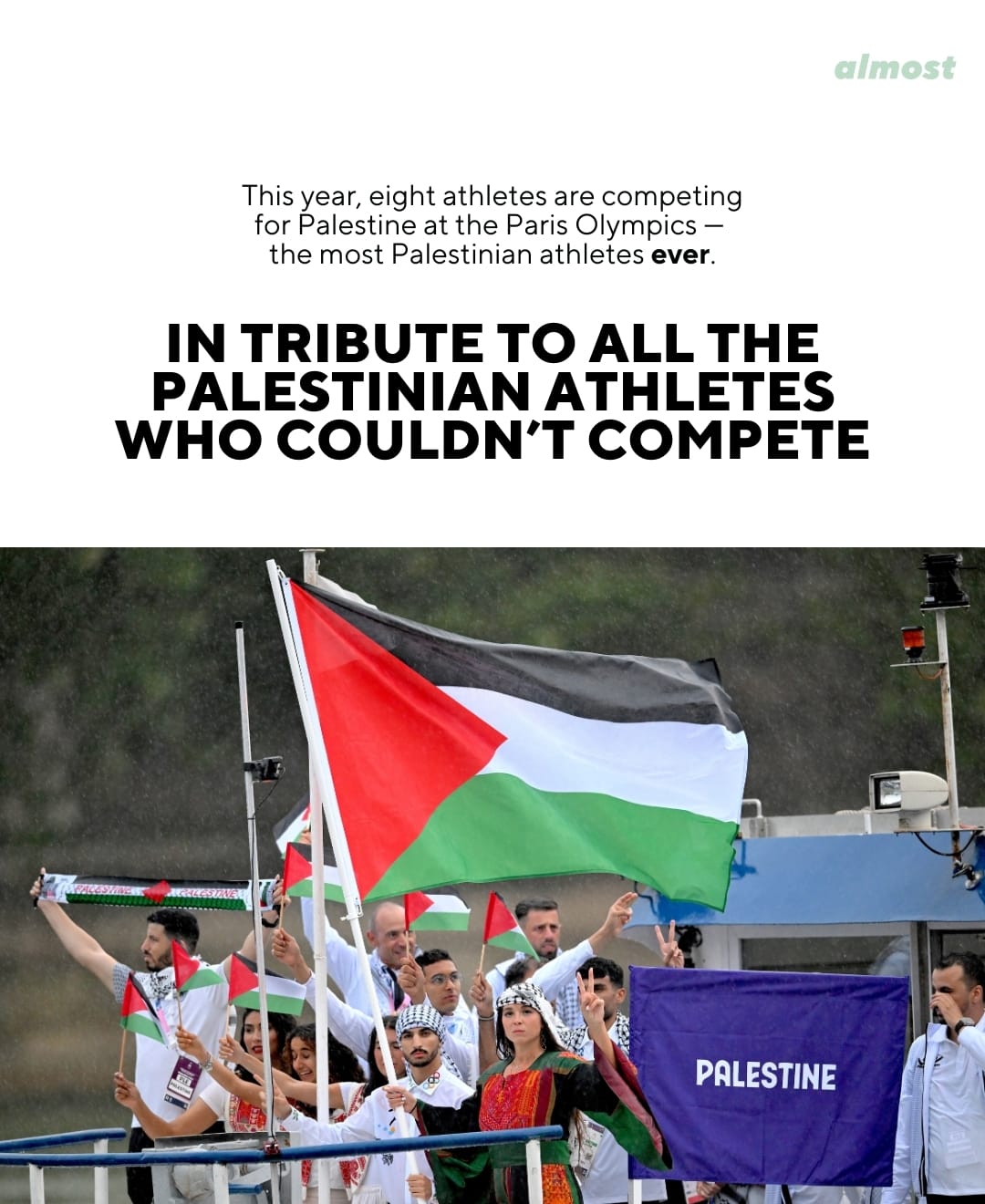 "While the world’s eyes are on the screen watching the Olympics, we want to use our unique platform as athletes to keep eyes on what’s going on in Palestine. I run for Palestine to represent something bigger than myself, the resilience of the Palestinian people, to bring voices to the voiceless."