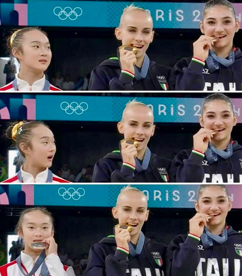 1. Chinese gymnast Zhou Yaqin learned the medal-biting tradition on the podium after winning silver
