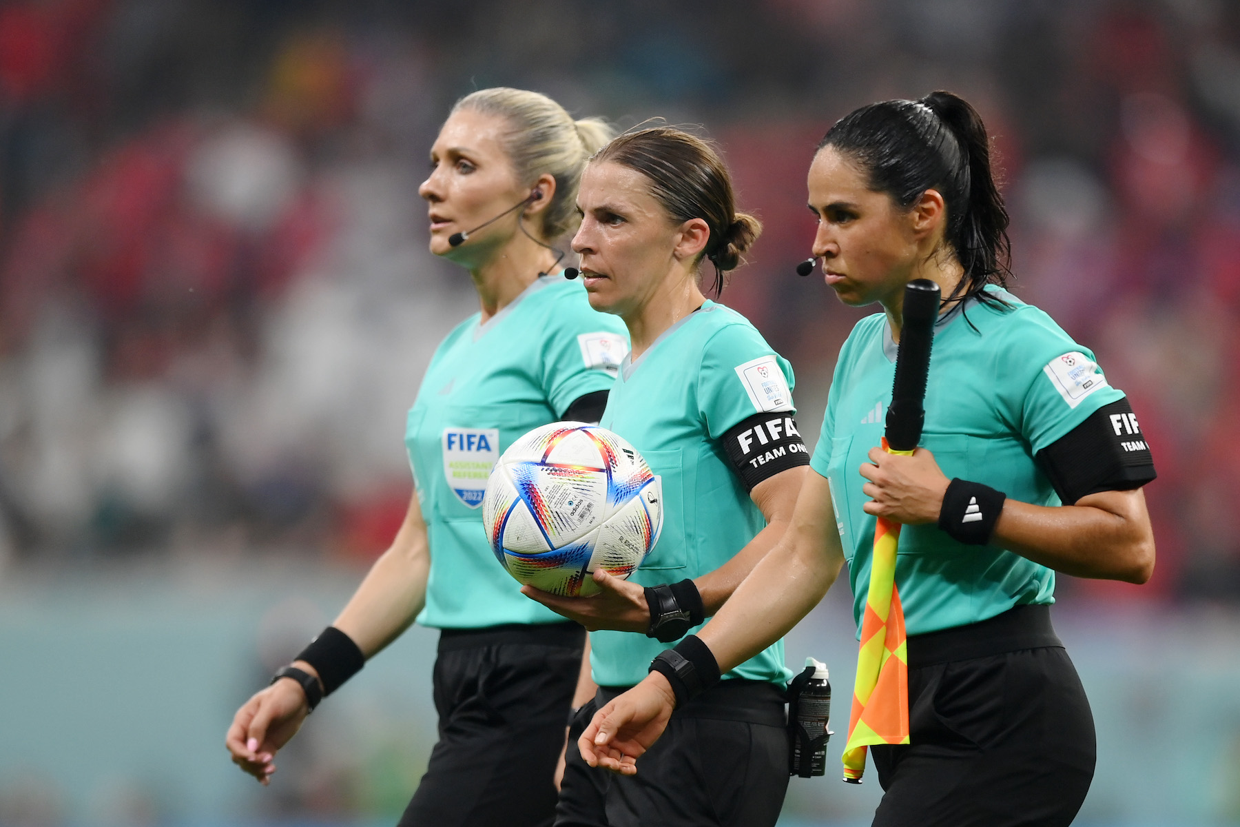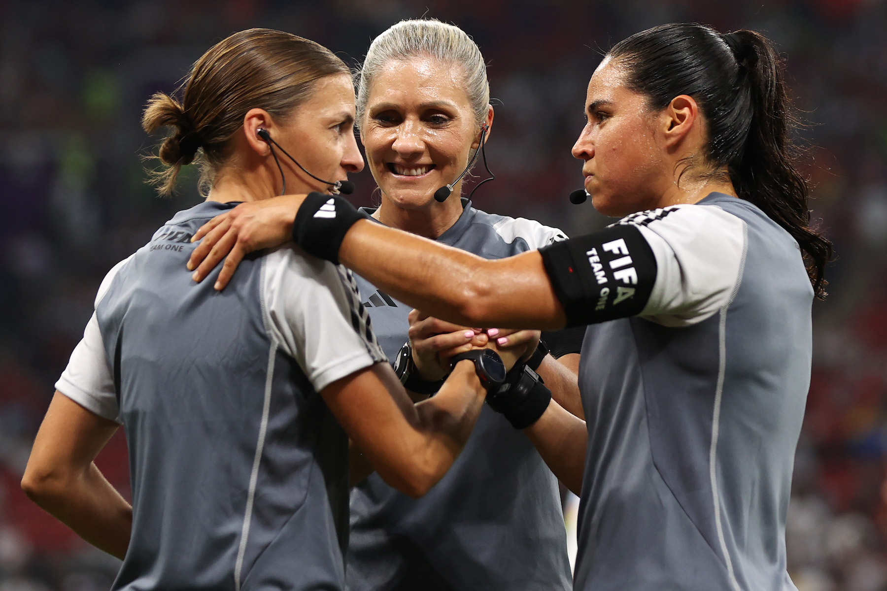 Referees Neuza Ines Back, Stephanie Frappart and Karen Diaz Medina walk off the pitch after the first half during the FIFA World Cup Qatar 2022 Group E match between Costa Rica and Germany at Al Bayt Stadium on Dec. 1, 2022 in Al Khor, Qatar. (Photo by Shaun Botterill – FIFA/FIFA via Getty Images)
