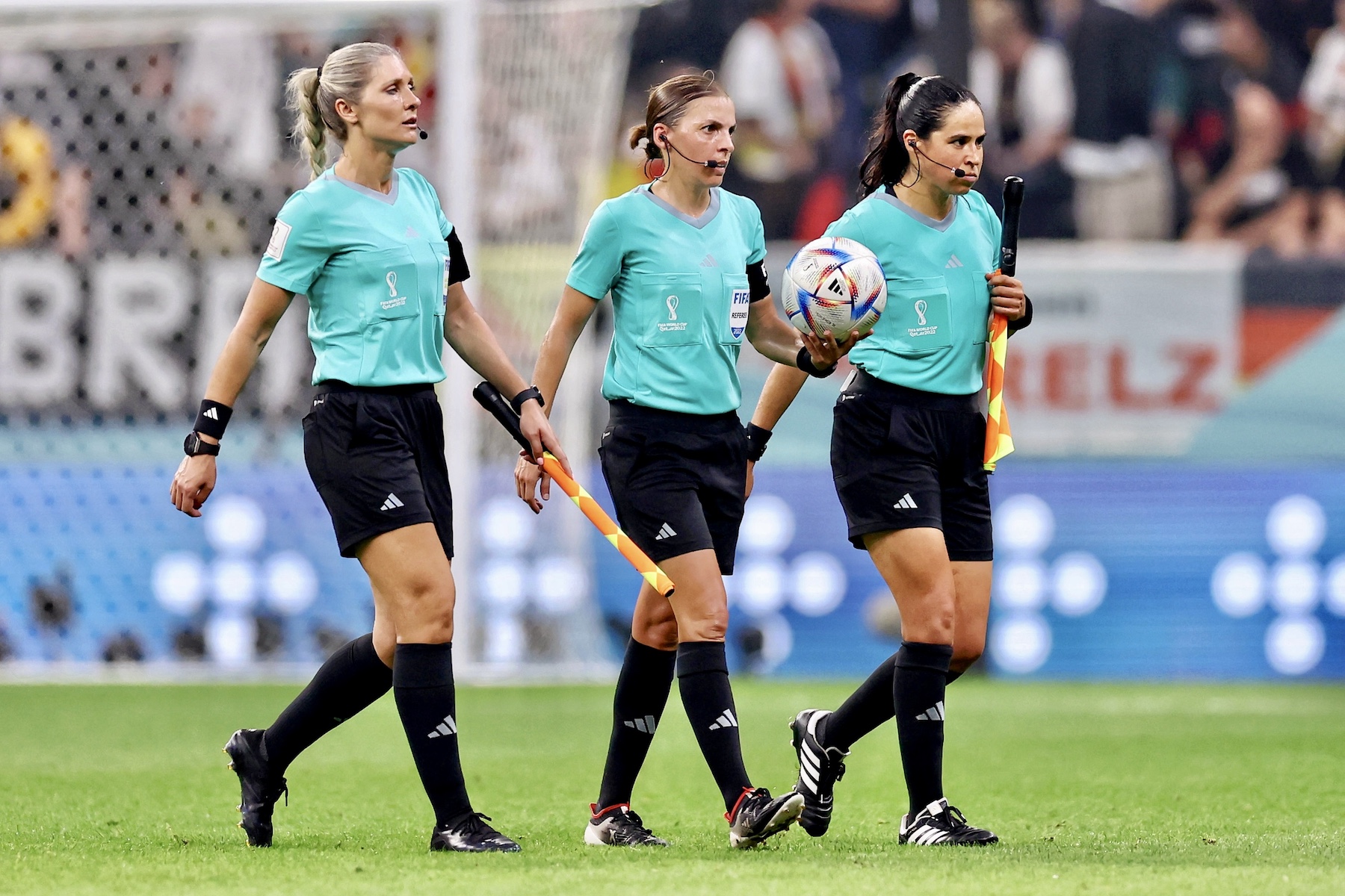Referees Neuza Ines Back, Stephanie Frappart and Karen Diaz Medina walk off the pitch after the first half during the FIFA World Cup Qatar 2022 Group E match between Costa Rica and Germany at Al Bayt Stadium on Dec. 1, 2022 in Al Khor, Qatar. (Photo by Hector Vivas – FIFA/FIFA via Getty Images)