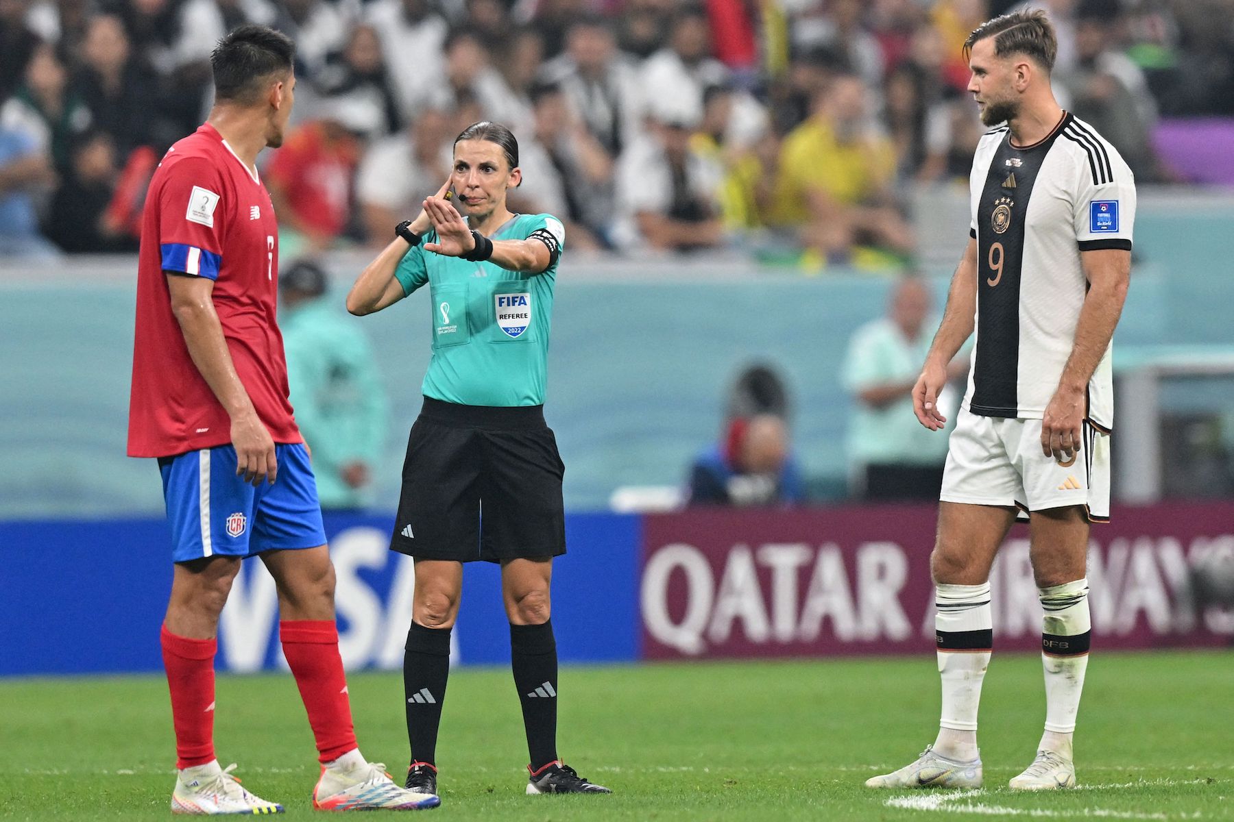 Referee Stephanie Frappart (C) gives instructions during the FIFA World Cup Qatar 2022 Group E match between Costa Rica and Germany at Al Bayt Stadium on Dec. 1, 2022 in Al Khor, Qatar. (Photo by Marvin Ibo Guengoer – GES Sportfoto/Getty Images)