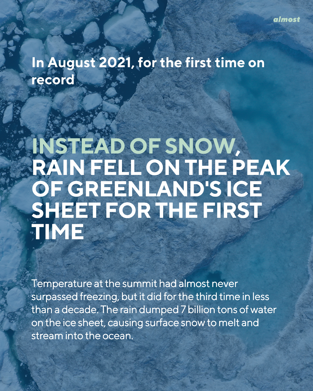 In August 2021, for the first time on record: Instead of snow, rain fell on the peak of greenland’s ice sheet for the first time.